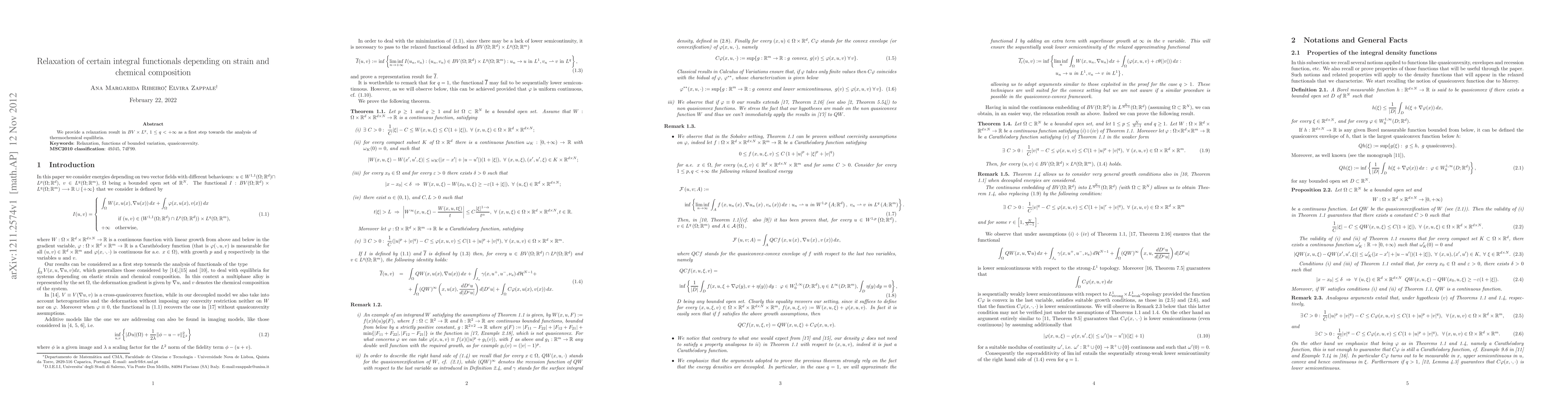 Summary: This paper presents a relaxation result in the function spaces $BV \times L^q$ for $1 \leq q < +\infty$, aiming to analyze thermochemical equilibria by studying integral functionals dependent on strain and chemical composition.