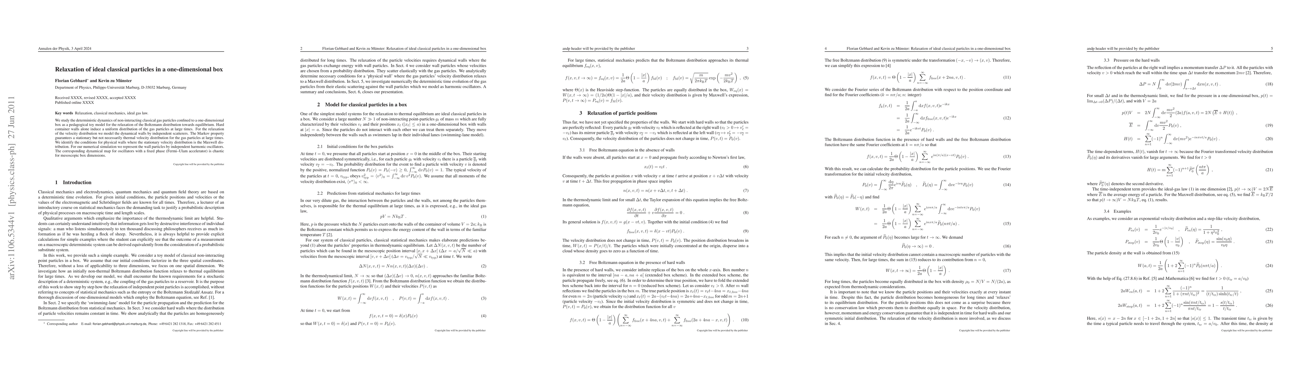 We study the deterministic dynamics of non-interacting classical gas particles confined to a one-dimensional box as a pedagogical toy model for the relaxation of the Boltzmann distribution towards equilibrium. Hard container walls alone induce a uniform distribution of the gas particles at large times. For the relaxation of the velocity distribution we model the dynamical walls by independent scatterers. The Markov property guarantees a stationary but not necessarily thermal velocity distribution for the gas particles at large times. We identify the conditions for physical walls where the stationary velocity distribution is the Maxwell distribution. For our numerical simulation we represent the wall particles by independent harmonic oscillators. The corresponding dynamical map for oscillators with a fixed phase (Fermi--Ulam accelerator) is chaotic for mesoscopic box dimensions.