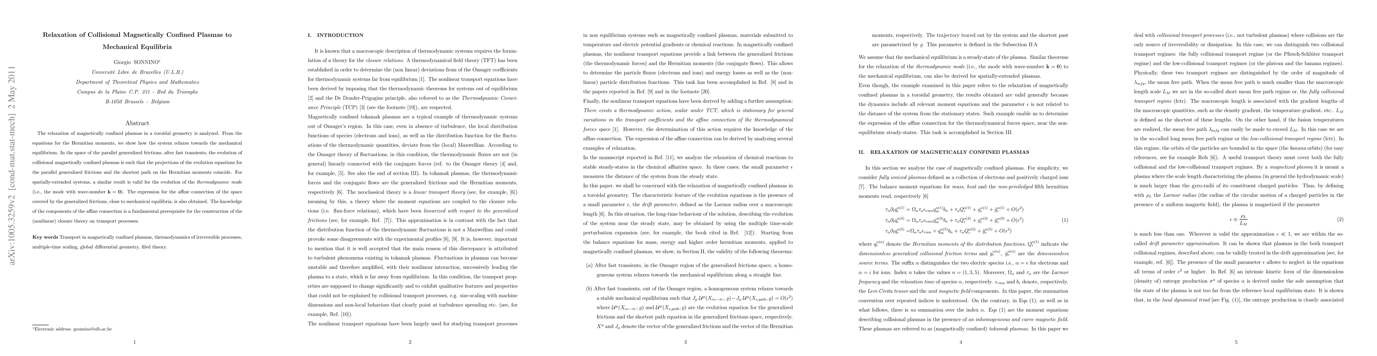 The relaxation of magnetically confined plasmas in a toroidal geometry is analyzed. From the equations for the Hermitian moments, we show how the system relaxes towards the mechanical equilibrium. In the space of the parallel generalized frictions, after fast transients, the evolution of collisional magnetically confined plasmas is such that the projections of the evolution equations for the parallel generalized frictions and the shortest path on the Hermitian moments coincide. For spatially-extended systems, a similar result is valid for the evolution of the {\it thermodynamic mode} (i.e., the mode with wave-number k = 0). The expression for the affine connection of the space covered by the generalized frictions, close to mechanical equilibria, is also obtained. The knowledge of the components of the affine connection is a fundamental prerequisite for the construction of the (nonlinear) closure theory on transport processes.