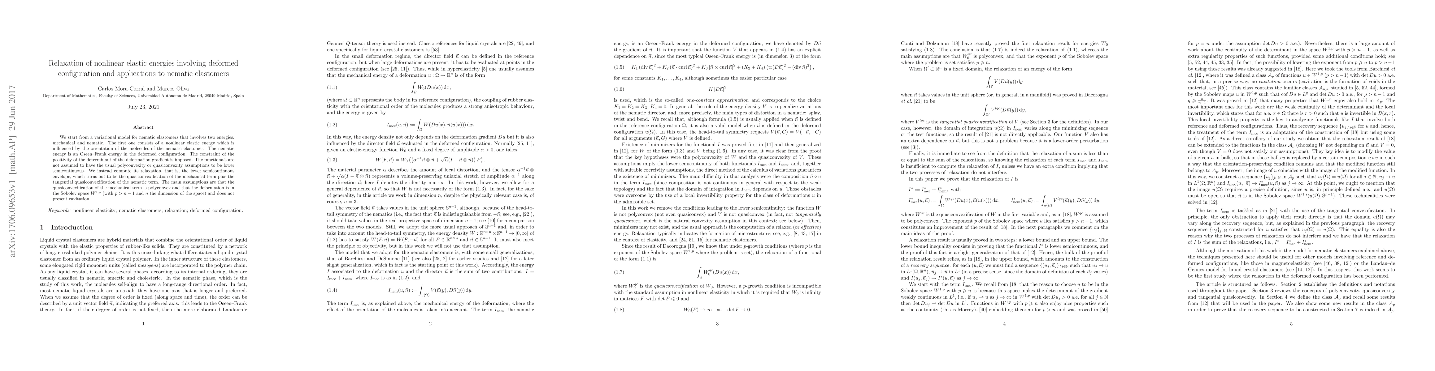 We start from a variational model for nematic elastomers that involves two energies: mechanical and nematic. The first one consists of a nonlinear elastic energy which is influenced by the orientation of the molecules of the nematic elastomer. The nematic energy is an Oseen--Frank energy in the deformed configuration. The constraint of the positivity of the determinant of the deformation gradient is imposed. The functionals are not assumed to have the usual polyconvexity or quasiconvexity assumptions to be lower semicontinuous. We instead compute its relaxation, that is, the lower semicontinuous envelope, which turns out to be the quasiconvexification of the mechanical term plus the tangential quasiconvexification of the nematic term. The main assumptions are that the quasiconvexification of the mechanical term is polyconvex and that the deformation is in the Sobolev space $W^{1,p}$ (with $p>n-1$ and $n$ the dimension of the space) and does not present cavitation.