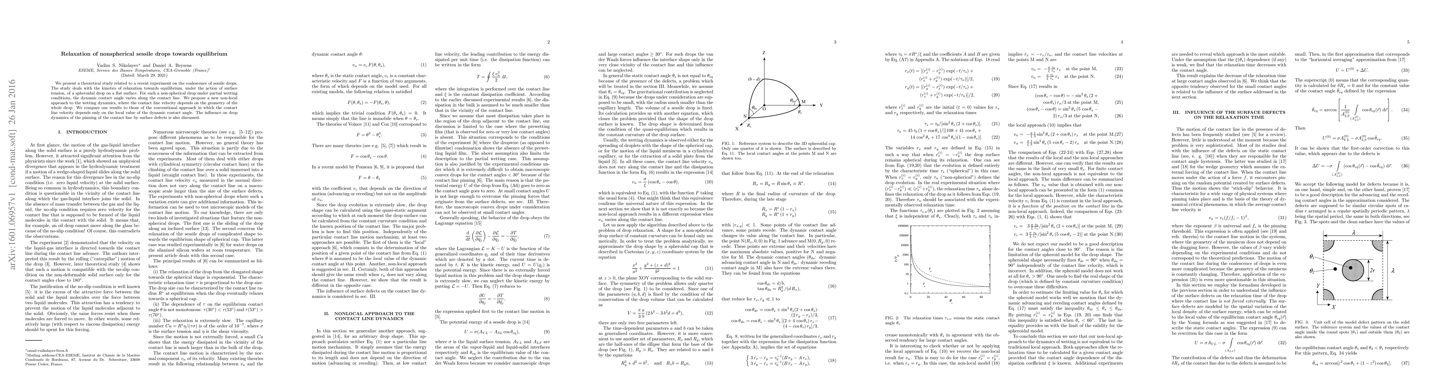 This paper proposes a new nonlocal theoretical model to study the relaxation kinetics of nonspherical sessile drops towards equilibrium, contrasting it with the conventional local approach. The model considers the dynamic contact angle variation along the contact line and discusses the impact of surface defects on the contact line pinning.