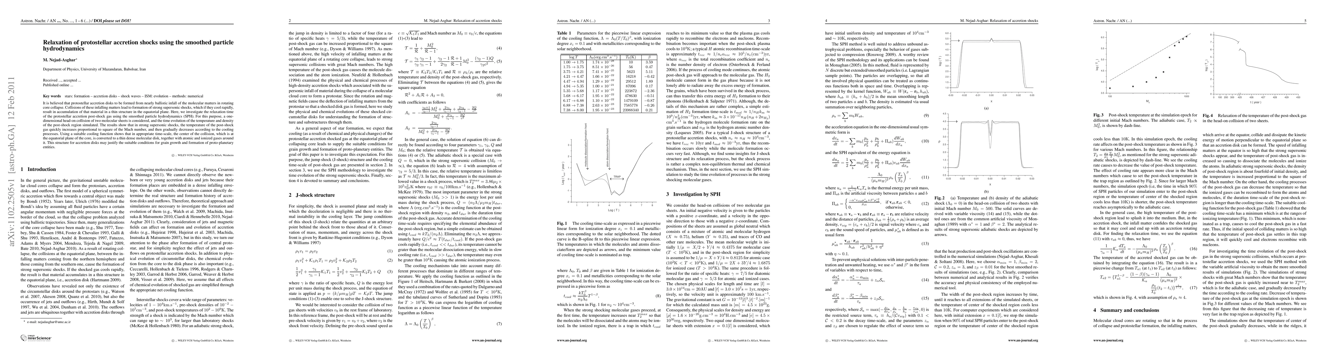 It is believed that protostellar accretion disks to be formed from nearly ballistic infall of the molecular matters in rotating core collapse. Collisions of these infalling matters lead to formation of strong supersonic shocks, which if they cool rapidly, result in accumulation of that material in a thin structure in the equatorial plane. Here, we investigate the relaxation time of the protostellar accretion post-shock gas using the smoothed particle hydrodynamics (SPH). For this purpose, a one-dimensional head-on collision of two molecular sheets is considered, and the time evolution of the temperature and density of the post-shock region simulated. The results show that in strong supersonic shocks, the temperature of the post-shock gas quickly increases proportional to square of the Mach number, and then gradually decreases according to the cooling processes. Using a suitable cooling function shows that in appropriate time-scale, the center of the collision, which is at the equatorial plane of the core, is converted to a thin dense molecular disk, together with atomic and ionized gases around it. This structure for accretion disks may justify the suitable conditions for grain growth and formation of proto-planetary entities.