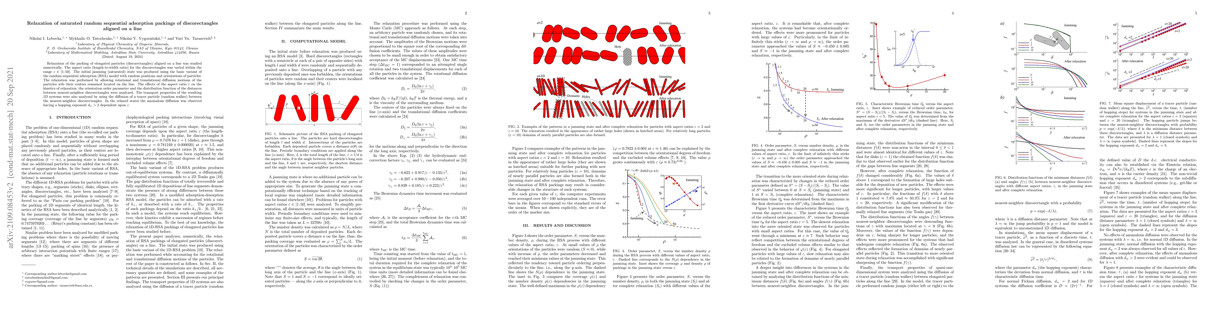 Relaxation of the packing of elongated particles (discorectangles) aligned on a line was studied numerically. The aspect ratio (length-to-width ratio) for the discorectangles was varied within the range $\varepsilon \in [1;50]$. The initial jamming (saturated) state was produced using the basic variant of the random sequential adsorption (RSA) model with random positions and orientations of particles. The relaxation was performed by allowing rotational and translational diffusion motions of the particles wile their centers remained located on the line. The effects of the aspect ratio $\varepsilon$ on the kinetics of relaxation, the orientation order parameter and the distribution function of the distances between nearest-neighbor discorectangles were analyzed. The transport properties of the resulting 1D systems were also analyzed by using the diffusion of a tracer particle (random walker) between the nearest-neighbor discorectangles. In the relaxed states the anomalous diffusion was observed having a hopping exponent $d_w>2$ dependent upon $\varepsilon$.