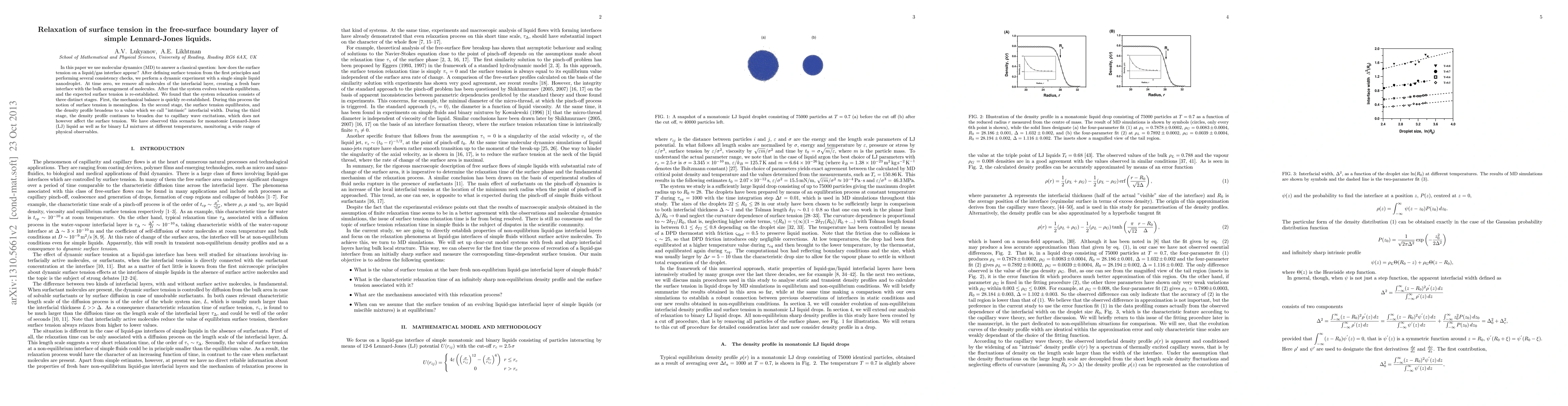 This paper uses molecular dynamics to investigate the relaxation of surface tension in simple Lennard-Jones liquids, revealing a three-stage process: initial mechanical re-establishment, surface tension equilibration, and density profile broadening due to capillary waves without surface tension change. The findings apply to both monatomic and binary Lennard-Jones mixtures across various temperatures.