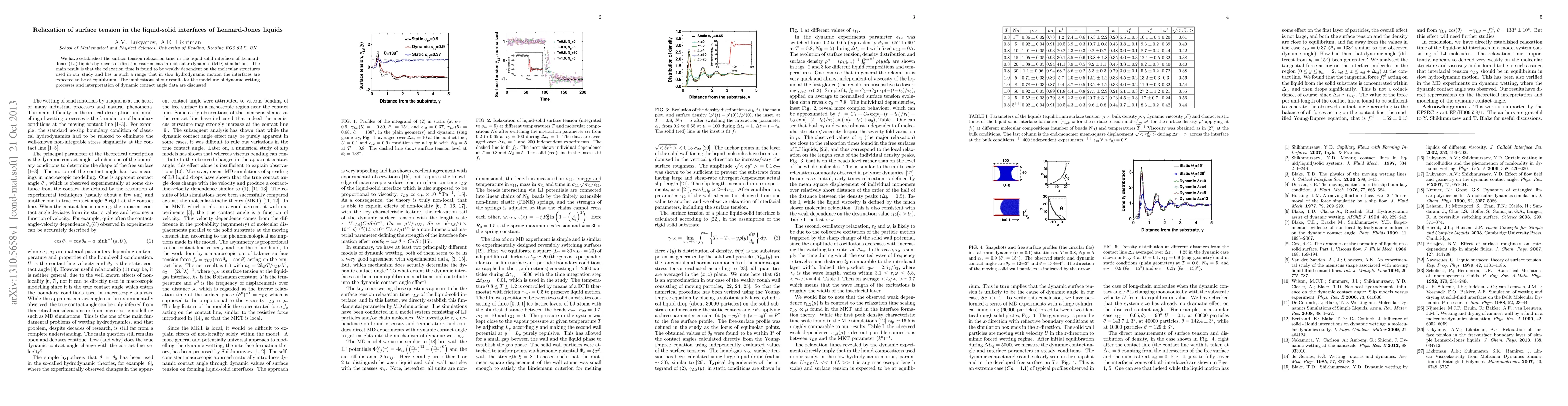 We have established the surface tension relaxation time in the liquid-solid interfaces of Lennard-Jones (LJ) liquids by means of direct measurements in molecular dynamics (MD) simulations. The main result is that the relaxation time is found to be weakly dependent on the molecular structures used in our study and lies in such a range that in slow hydrodynamic motion the interfaces are expected to be at equilibrium. The implications of our results for the modelling of dynamic wetting processes and interpretation of dynamic contact angle data are discussed.