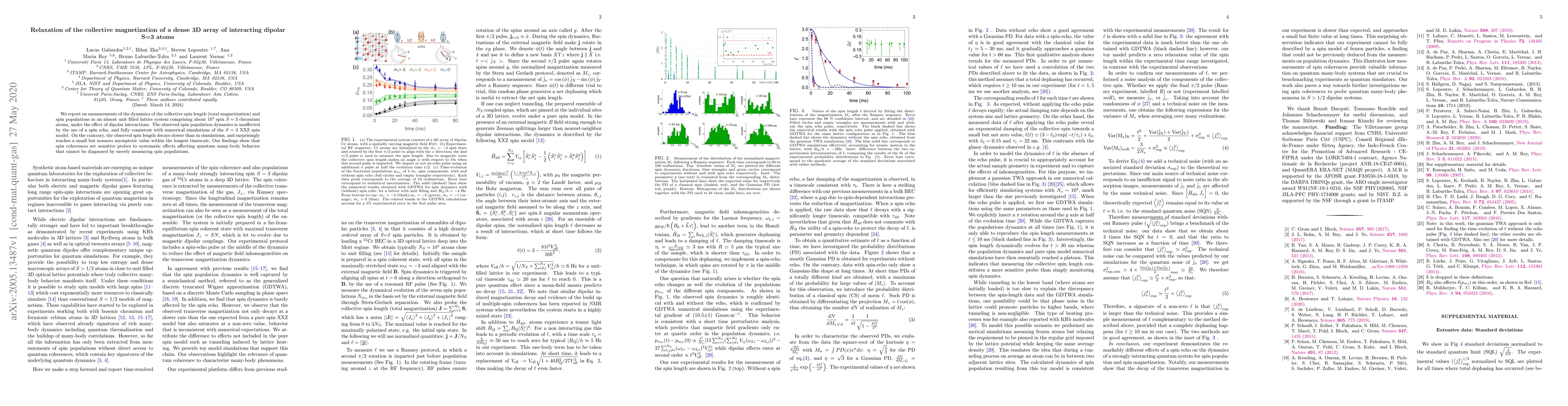 We report on measurements of the dynamics of the collective spin length (total magnetization) and spin populations in an almost unit filled lattice system comprising about 10^4 spin S=3 chromium atoms, under the effect of dipolar interactions. The observed spin population dynamics is unaffected by the use of a spin echo, and fully consistent with numerical simulations of the S=3 XXZ spin model. On the contrary, the observed spin length decays slower than in simulations, and surprisingly reaches a small but nonzero asymptotic value within the longest timescale. Our findings show that spin coherences are sensitive probes to systematic effects affecting quantum many-body behavior that cannot be diagnosed by merely measuring spin populations.