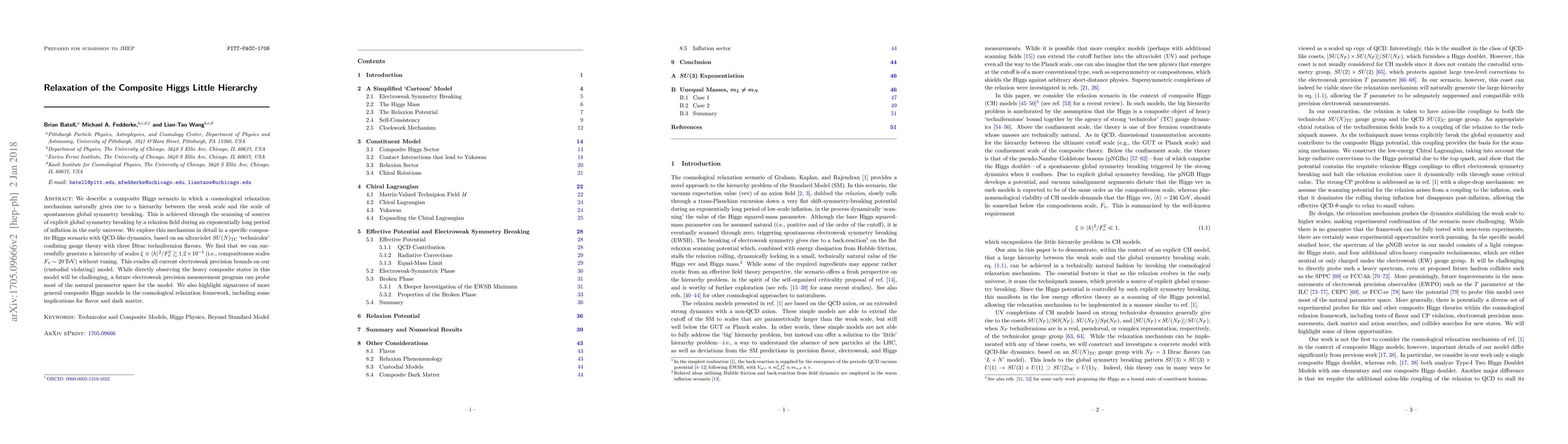 This paper explores a composite Higgs model where a cosmological relaxion mechanism naturally creates a hierarchy between the weak scale and the global symmetry breaking scale, achieved through inflation. The study finds that this model can generate a significant scale hierarchy without tuning, evading current electroweak precision bounds, and suggests future precision measurements could probe its parameter space.