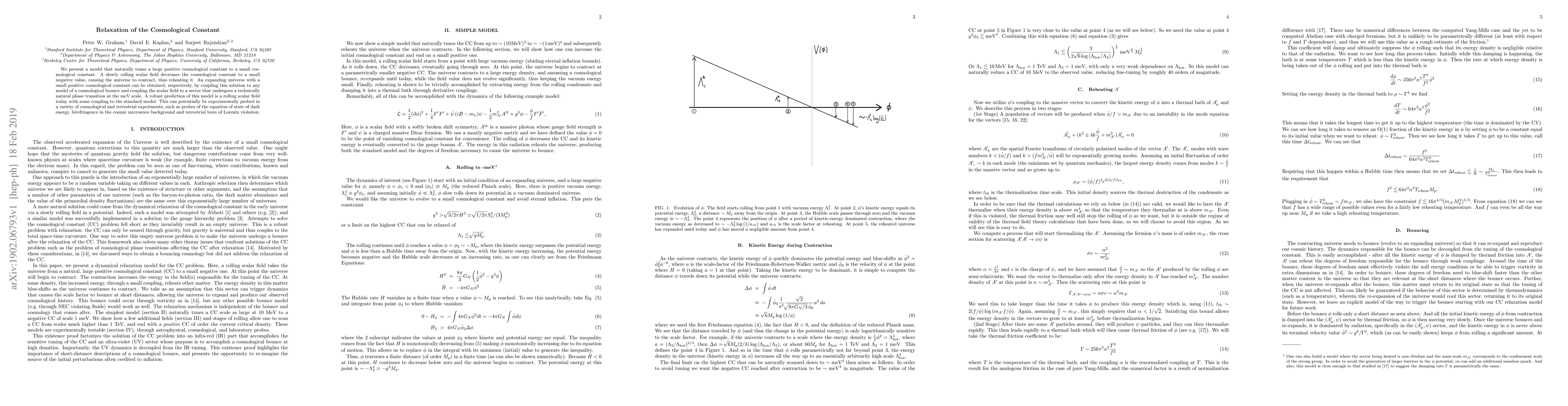 We present a model that naturally tunes a large positive cosmological constant to a small cosmological constant. A slowly rolling scalar field decreases the cosmological constant to a small negative value, causing the universe to contract, thus reheating it. An expanding universe with a small positive cosmological constant can be obtained, respectively, by coupling this solution to any model of a cosmological bounce and coupling the scalar field to a sector that undergoes a technically natural phase transition at the meV scale. A robust prediction of this model is a rolling scalar field today with some coupling to the standard model. This can potentially be experimentally probed in a variety of cosmological and terrestrial experiments, such as probes of the equation of state of dark energy, birefringence in the cosmic microwave background and terrestrial tests of Lorentz violation.