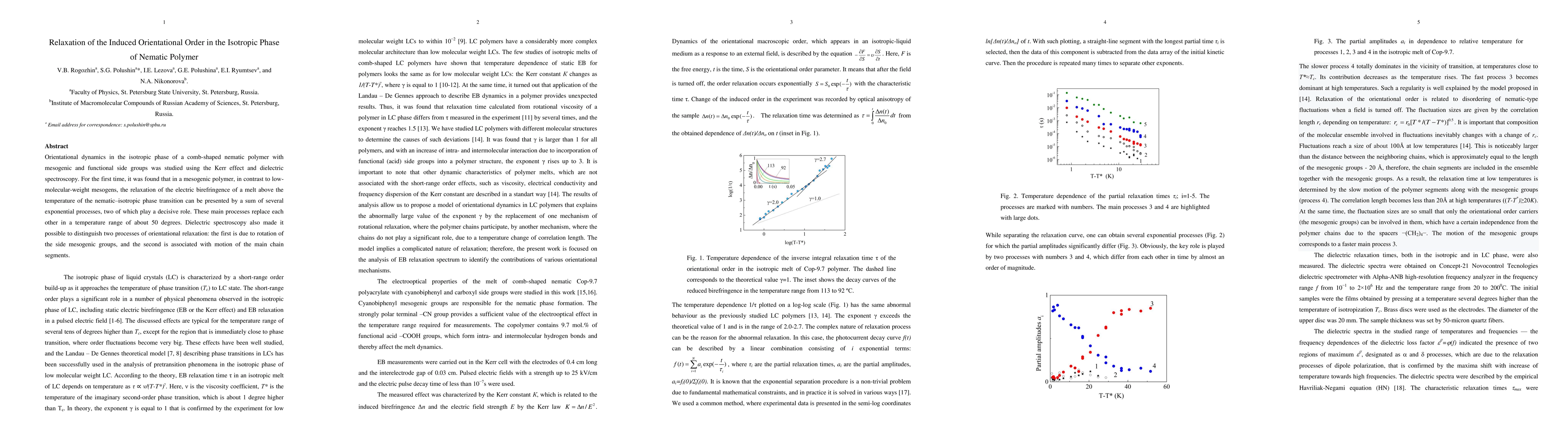 This study investigates the orientational dynamics in the isotropic phase of a comb-shaped nematic polymer using the Kerr effect and dielectric spectroscopy, revealing that the relaxation of electric birefringence above the nematic-isotropic phase transition can be described by multiple exponential processes, with two main processes dominating and replacing each other over a fifty-degree temperature range.