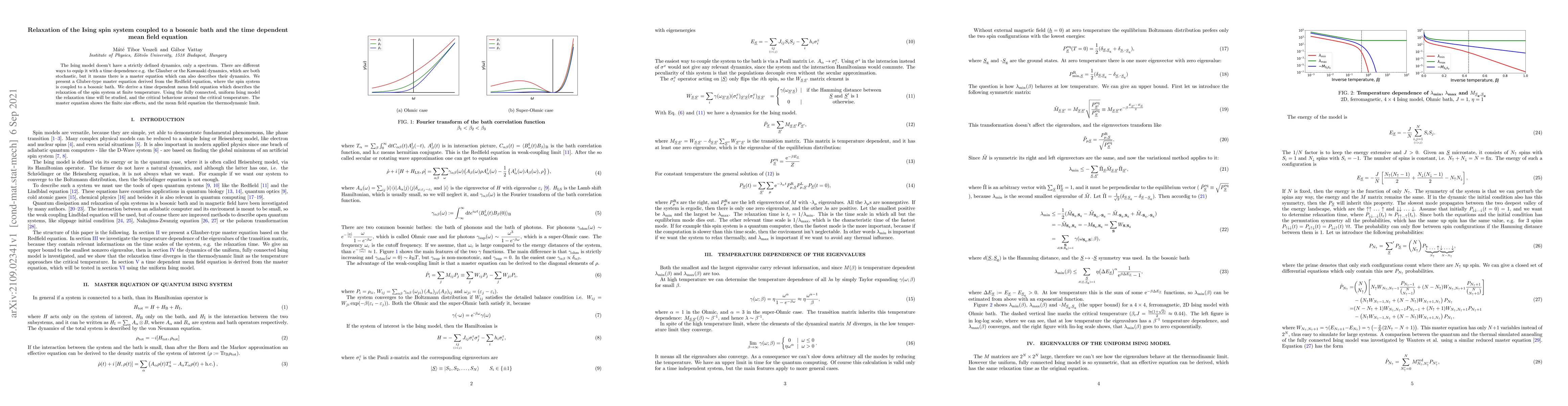 This paper develops a Glauber-type master equation derived from the Redfield equation to describe the dynamics of an Ising spin system coupled to a bosonic bath. It derives a time-dependent mean field equation to study the relaxation behavior at finite temperatures, focusing on the critical behavior around the critical temperature and finite size effects.