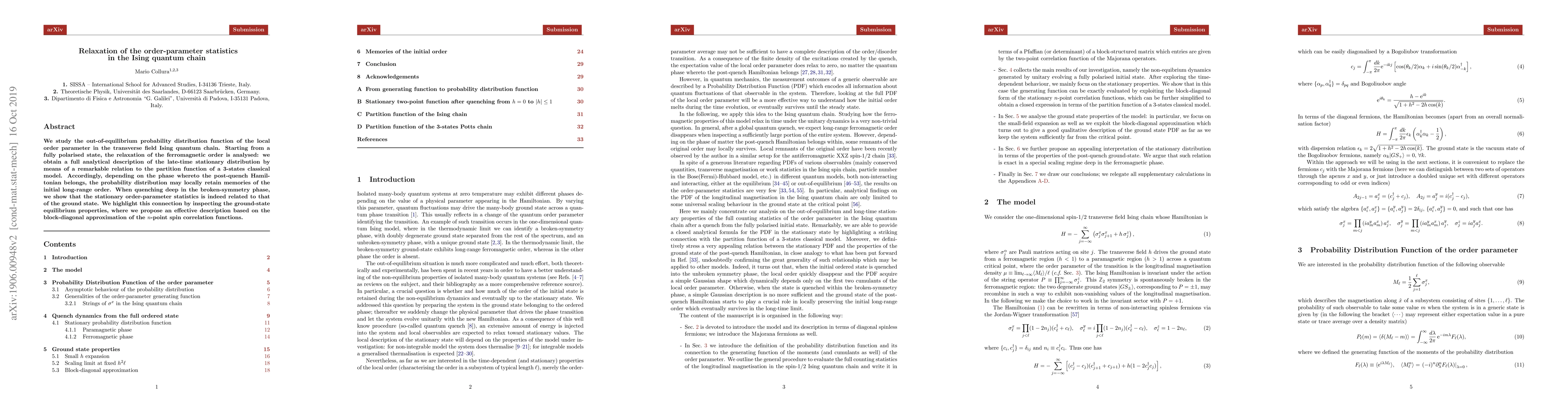 We study the out-of-equilibrium probability distribution function of the local order parameter in the transverse field Ising quantum chain. Starting from a fully polarised state, the relaxation of the ferromagnetic order is analysed: we obtain a full analytical description of the late-time stationary distribution by means of a remarkable relation to the partition function of a 3-states classical model. Accordingly, depending on the phase whereto the post-quench Hamiltonian belongs, the probability distribution may locally retain memories of the initial long-range order. When quenching deep in the broken-symmetry phase, we show that the stationary order-parameter statistics is indeed related to that of the ground state. We highlight this connection by inspecting the ground-state equilibrium properties, where we propose an effective description based on the block-diagonal approximation of the $n$-point spin correlation functions.