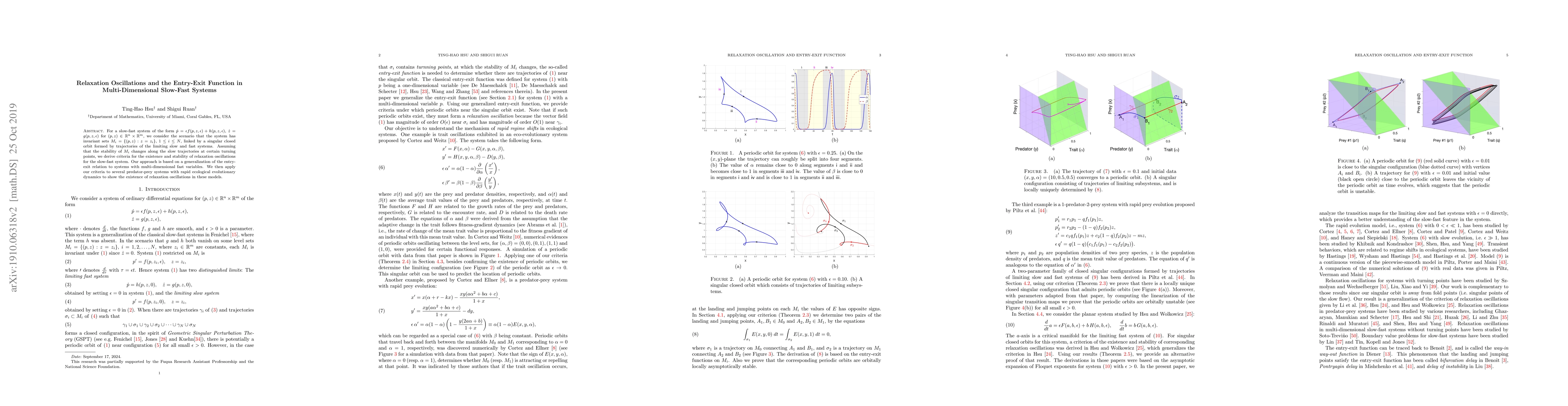 For a slow-fast system of the form $\dot{p}=\epsilon f(p,z,\epsilon)+h(p,z,\epsilon)$, $\dot{z}=g(p,z,\epsilon)$ for $(p,z)\in \mathbb R^n\times \mathbb R^m$, we consider the scenario that the system has invariant sets $M_i=\{(p,z): z=z_i\}$, $1\le i\le N$, linked by a singular closed orbit formed by trajectories of the limiting slow and fast systems. Assuming that the stability of $M_i$ changes along the slow trajectories at certain turning points, we derive criteria for the existence and stability of relaxation oscillations for the slow-fast system. Our approach is based on a generalization of the entry-exit relation to systems with multi-dimensional fast variables. We then apply our criteria to several predator-prey systems with rapid ecological evolutionary dynamics to show the existence of relaxation oscillations in these models.