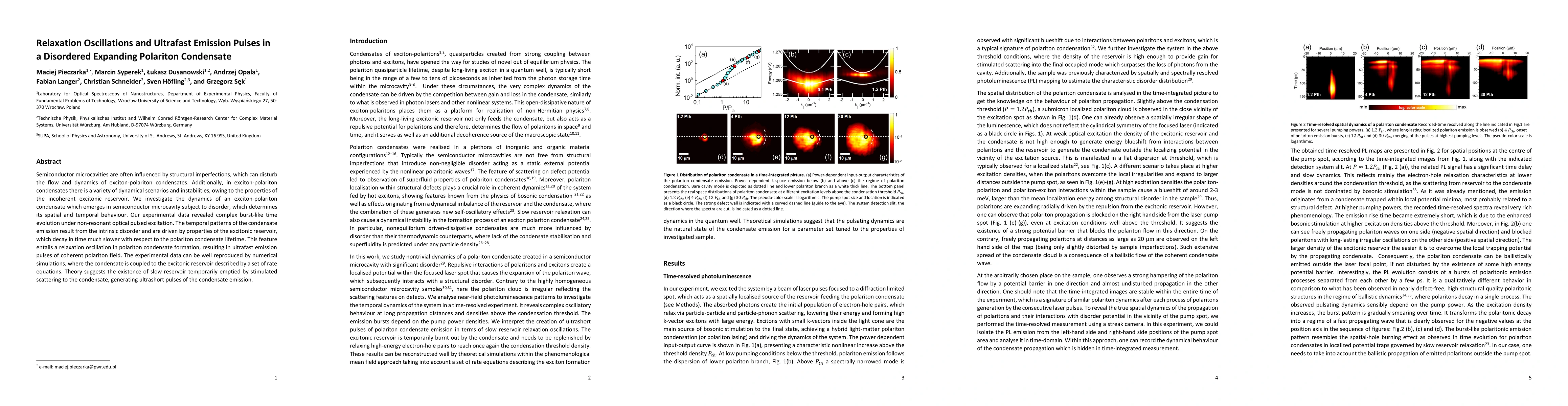 The study investigated an extended exciton-polariton condensate within a moderate quality cavity with non-negligible disorder potential. Near-field images of polariton condensate luminescence were analyzed, and time-resolved spatial dynamics were tracked, revealing complex burst-like behavior in polariton condensation interpreted as relaxation oscillation in condensate formation.