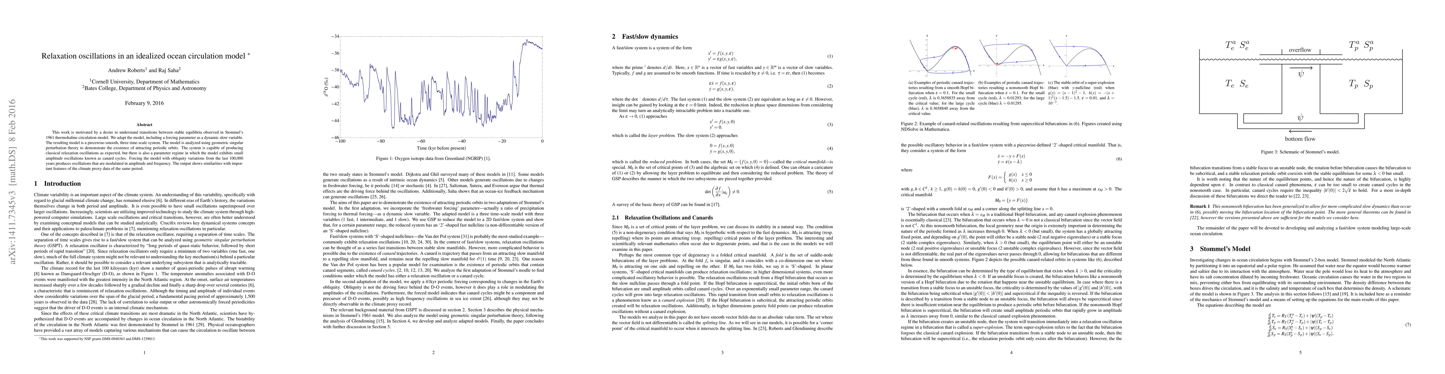 This paper adapts Stommel's thermohaline circulation model to explore transitions between stable equilibria, revealing relaxation oscillations and canard cycles through geometric singular perturbation theory. The model's output, modulated by historical obliquity variations, shows similarities with climate proxy data.