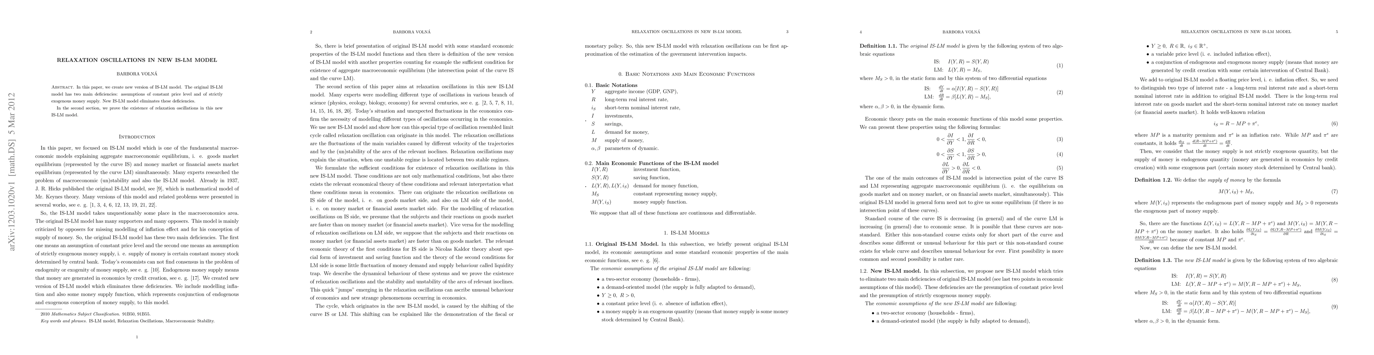 In this paper, we create new version of IS-LM model. The original IS-LM model has two main deficiencies: assumptions of constant price level and of strictly exogenous money supply. New IS-LM model eliminates these deficiencies. In the second section, we prove the existence of relaxation oscillations in this new IS-LM model.