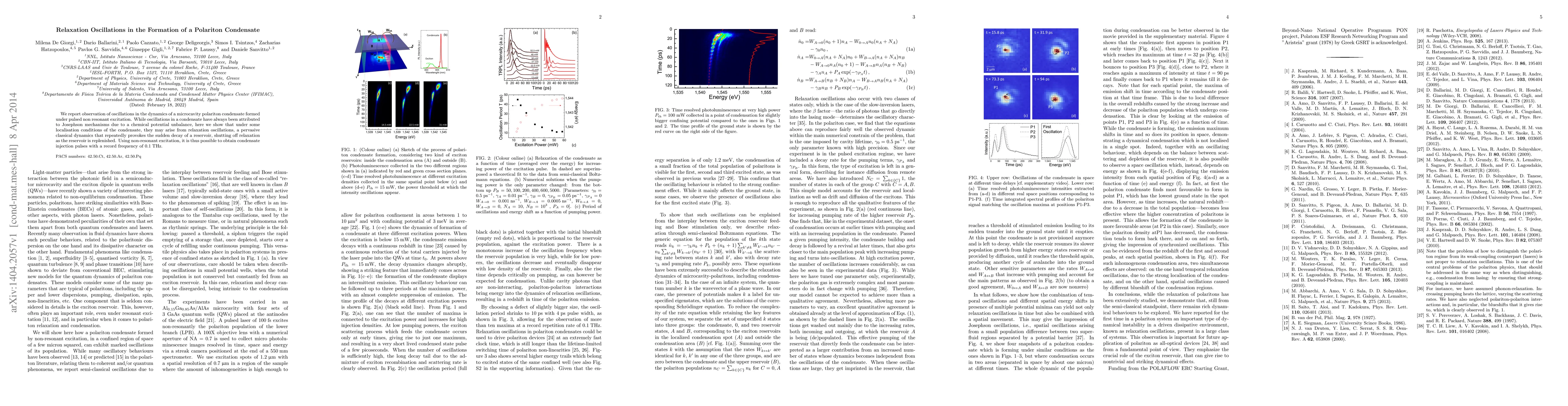 We report observation of oscillations in the dynamics of a microcavity polariton condensate formed under pulsed non resonant excitation. While oscillations in a condensate have always been attributed to Josephson mechanisms due to a chemical potential unbalance, here we show that under some localisation conditions of the condensate, they may arise from relaxation oscillations, a pervasive classical dynamics that repeatedly provokes the sudden decay of a reservoir, shutting off relaxation as the reservoir is replenished. Using non-resonant excitation, it is thus possible to obtain condensate injection pulses with a record frequency of 0:1 THz.