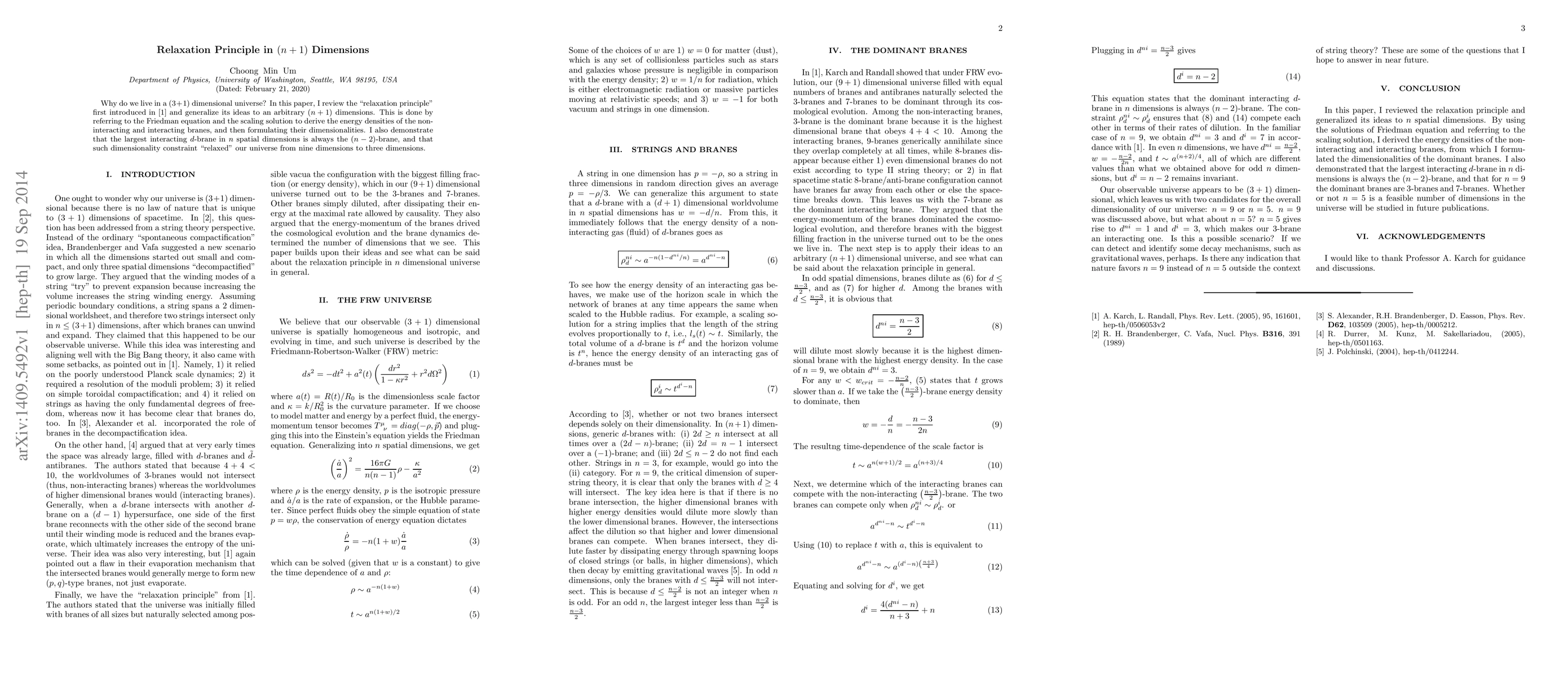This paper reviews the relaxation principle to explain why our universe is (3+1) dimensional, generalizing it to (n+1) dimensions. It uses the Friedman equation and scaling solutions to derive energy densities of branes, showing that the largest interacting d-brane constrains dimensionality, ultimately "relaxing" our universe from nine dimensions to three.