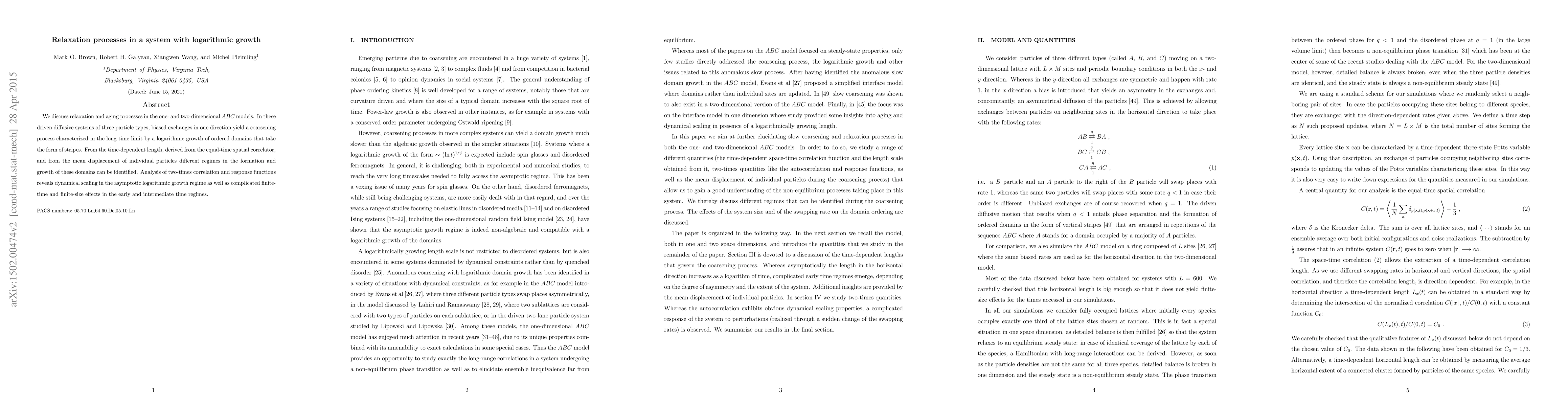 This paper investigates relaxation and aging in $ABC$ models with biased exchanges, showing that in the long time limit, the growth of ordered stripe domains follows a logarithmic trend. It identifies different regimes in domain formation and growth, and finds dynamical scaling in the logarithmic growth regime while also noting complex finite-time and size effects in earlier stages.