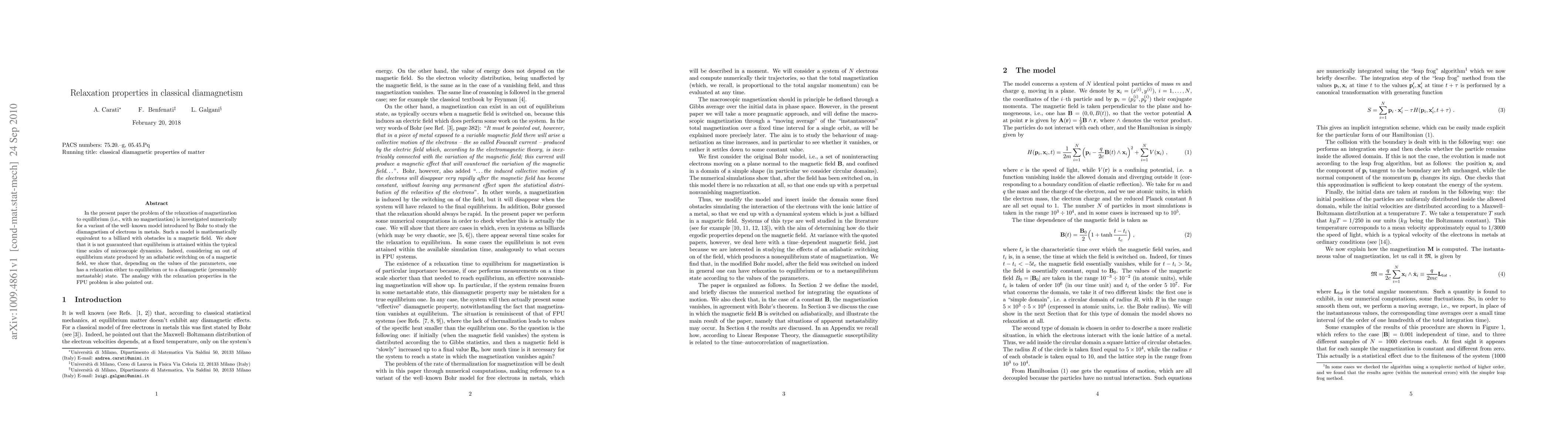 In the present paper the problem of the relaxation of magnetization to equilibrium (i.e., with no magnetization) is investigated numerically for a variant of the well-known model introduced by Bohr to study the diamagnetism of electrons in metals. Such a model is mathematically equivalent to a billiard with obstacles in a magnetic field. We show that it is not guaranteed that equilibrium is attained within the typical time scales of microscopic dynamics. Indeed, considering an out of equilibrium state produced by an adiabatic switching on of a magnetic field, we show that, depending on the values of the parameters, one has a relaxation either to equilibrium or to a diamagnetic (presumably metastable) state. The analogy with the relaxation properties in the FPU problem is also pointed out.