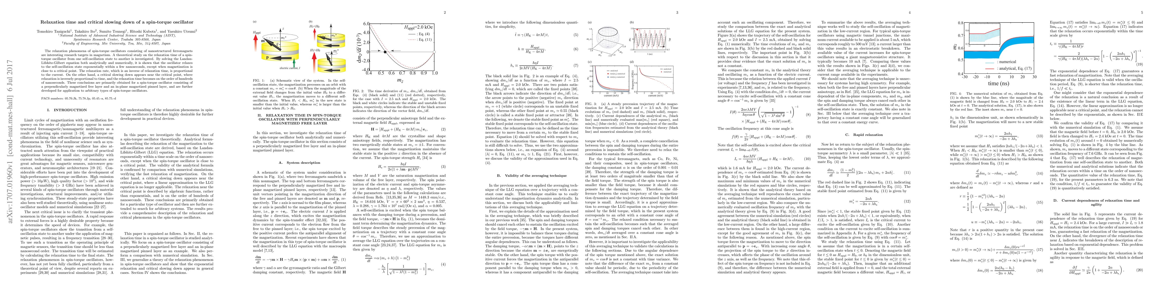 This paper investigates the relaxation time of spin-torque oscillators, showing that they transition states exponentially within nanoseconds, except near critical points where relaxation slows dramatically. Critical slowing down near critical points results in relaxation times on the order of hundreds of nanoseconds.