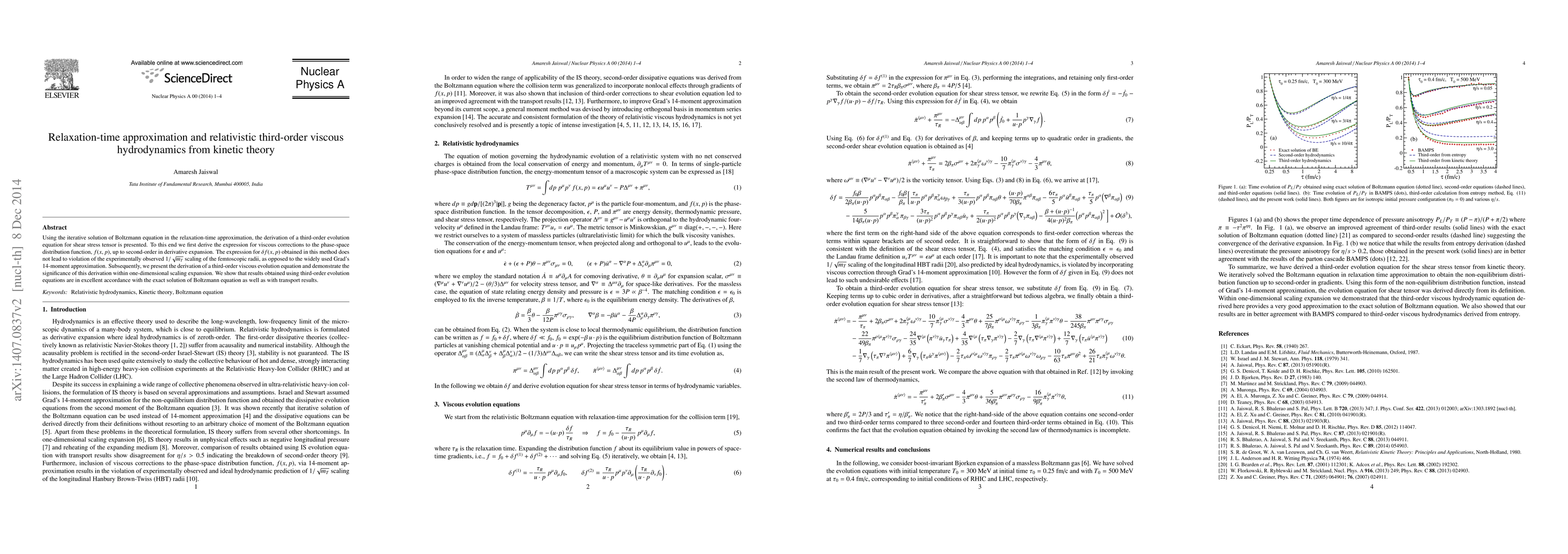 This paper derives a third-order evolution equation for the shear stress tensor from kinetic theory using the relaxation-time approximation of the Boltzmann equation. Unlike Grad's 14-moment method, it maintains experimentally observed scaling in femtoscopic radii and aligns well with exact solutions and transport results.