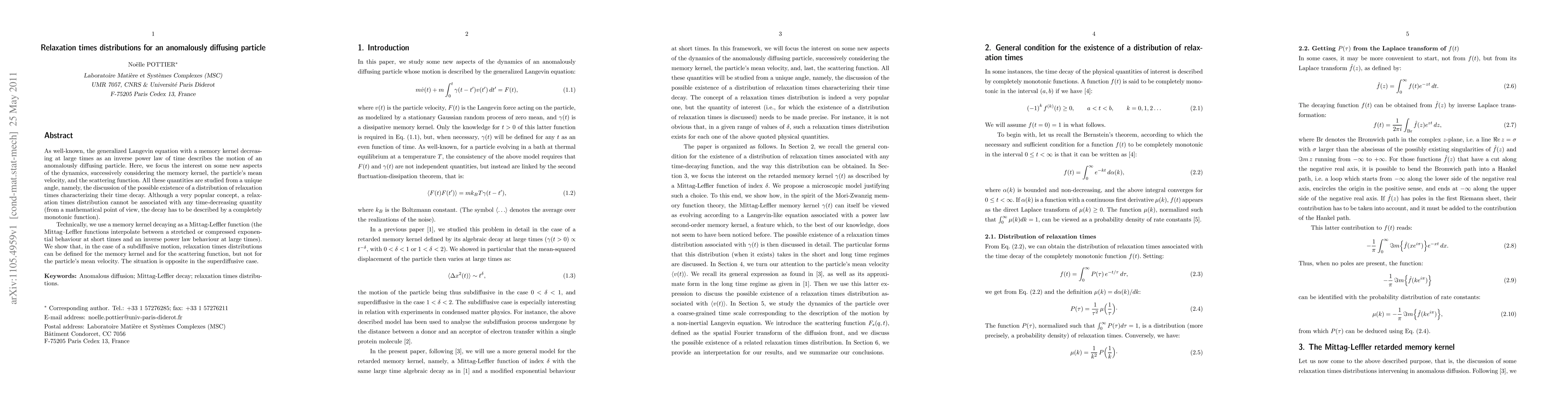 As well known, the generalized Langevin equation with a memory kernel decreasing at large times as an inverse power law of time describes the motion of an anomalously diffusing particle. Here, we focus attention on some new aspects of the dynamics, successively considering the memory kernel, the particle's mean velocity, and the scattering function. All these quantities are studied from a unique angle, namely, the discussion of the possible existence of a distribution of relaxation times characterizing their time decay. Although a very popular concept, a relaxation time distribution cannot be associated with any time-decreasing quantity (from a mathematical point of view, the decay has to be described by a completely monotonic function). Technically, we use a memory kernel decaying as a Mittag-Leffler function (the Mittag-Leffler functions interpolate between stretched or compressed exponential behaviour at short times and inverse power law behaviour at large times). We show that, in the case of a subdiffusive motion, relaxation time distributions can be defined for the memory kernel and for the scattering function, but not for the particle's mean velocity. The situation is opposite in the superdiffusive case.