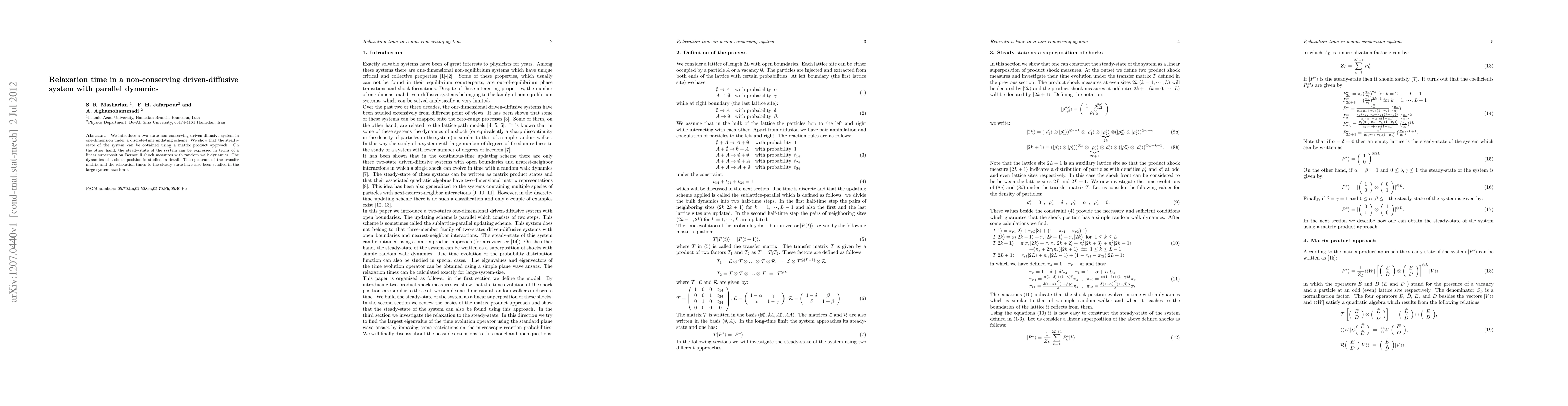 This paper investigates a one-dimensional, two-state non-conserving driven-diffusive system with parallel dynamics, demonstrating the use of a matrix product approach to reach the steady-state. It also explores the system's shock dynamics and relaxation times, revealing insights through a linear superposition of Bernoulli shock measures.