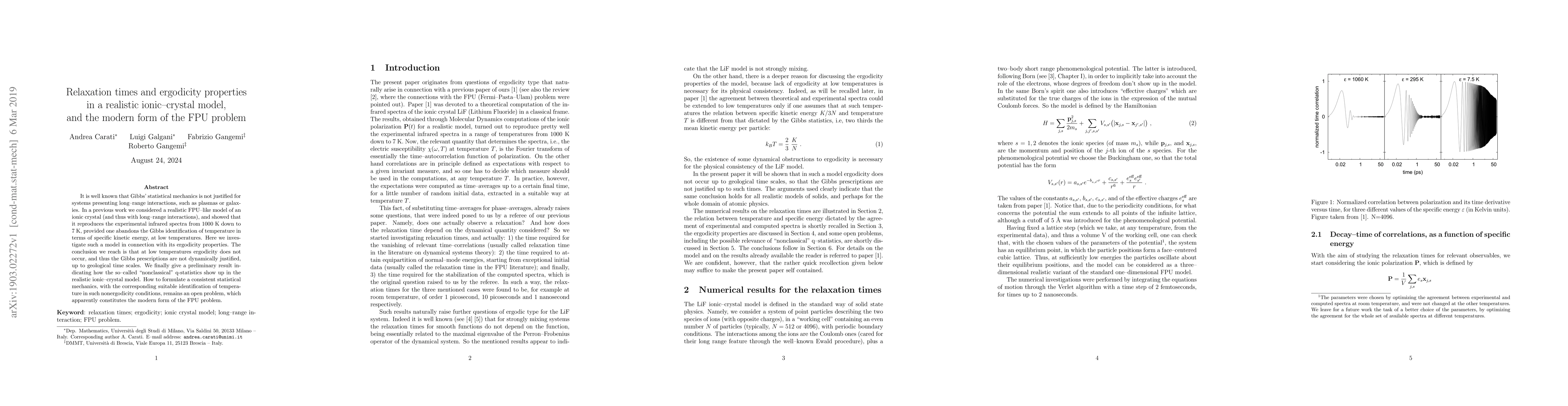 It is well known that Gibbs' statistical mechanics is not justified for systems presenting long-range interactions, such as plasmas or galaxies. In a previous work we considered a realistic FPU-like model of an ionic crystal (and thus with long-range interactions), and showed that it reproduces the experimental infrared spectra from 1000 K down to 7 K, provided one abandons the Gibbs identification of temperature in terms of specific kinetic energy, at low temperatures. Here we investigate such a model in connection with its ergodicity properties. The conclusion we reach is that at low temperatures ergodicity does not occur, and thus the Gibbs prescriptions are not dynamically justified, up to geological time scales. We finally give a preliminary result indicating how the so-called `nonclassical' q-statistics show up in the realistic ionic-crystal model. How to formulate a consistent statistical mechanics, with the corresponding suitable identification of temperature in such nonergodicity conditions, remains an open problem, which apparently constitutes the modern form of the FPU problem.