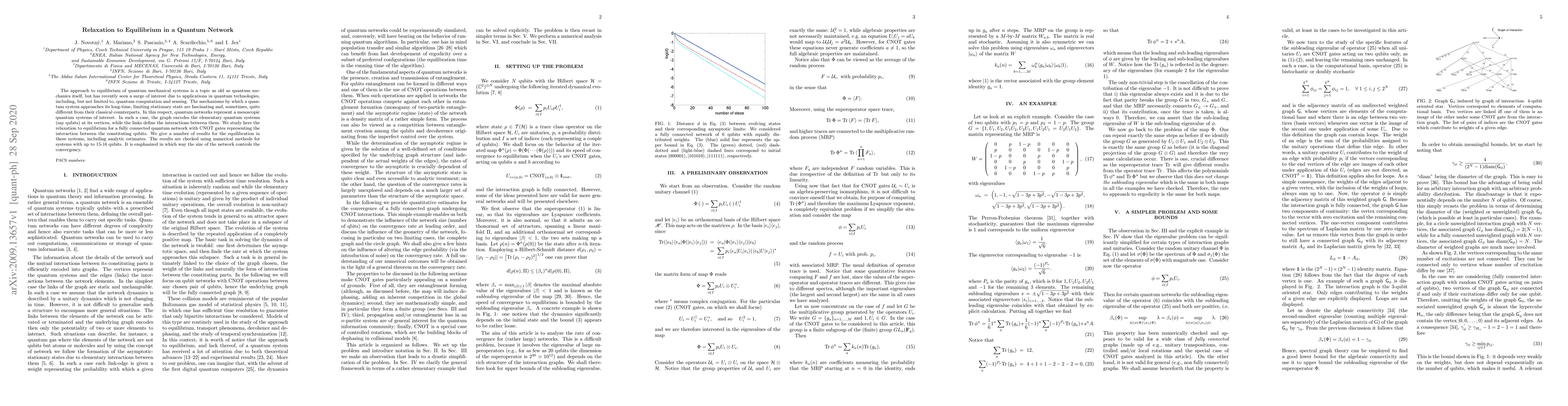 The approach to equilibrium of quantum mechanical systems is a topic as old as quantum mechanics itself, but has recently seen a surge of interest due to applications in quantum technologies, including, but not limited to, quantum computation and sensing. The mechanisms by which a quantum system approaches its long-time, limiting stationary state are fascinating and, sometimes, quite different from their classical counterparts. In this respect, quantum networks represent a mesoscopic quantum systems of interest. In such a case, the graph encodes the elementary quantum systems (say qubits) at its vertices, while the links define the interactions between them. We study here the relaxation to equilibrium for a fully connected quantum network with CNOT gates representing the interaction between the constituting qubits. We give a number of results for the equilibration in these systems, including analytic estimates. The results are checked using numerical methods for systems with up to 15-16 qubits. It is emphasized in which way the size of the network controls the convergency.