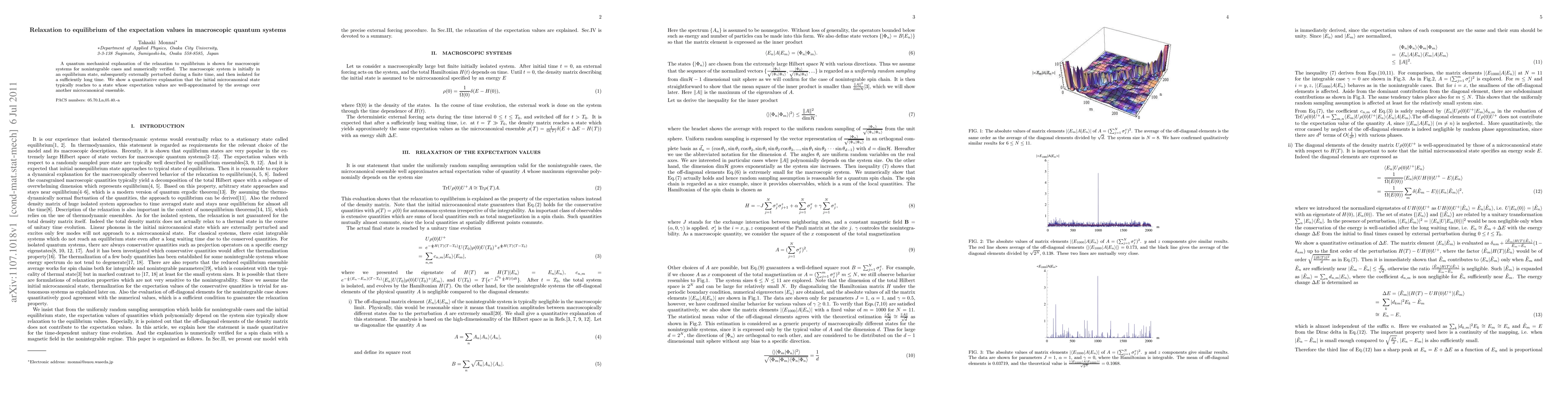 This paper provides a quantum mechanical explanation of the relaxation to equilibrium in macroscopic quantum systems, particularly for nonintegrable cases, and demonstrates that the initial microcanonical state approximates the equilibrium state through numerical verification.