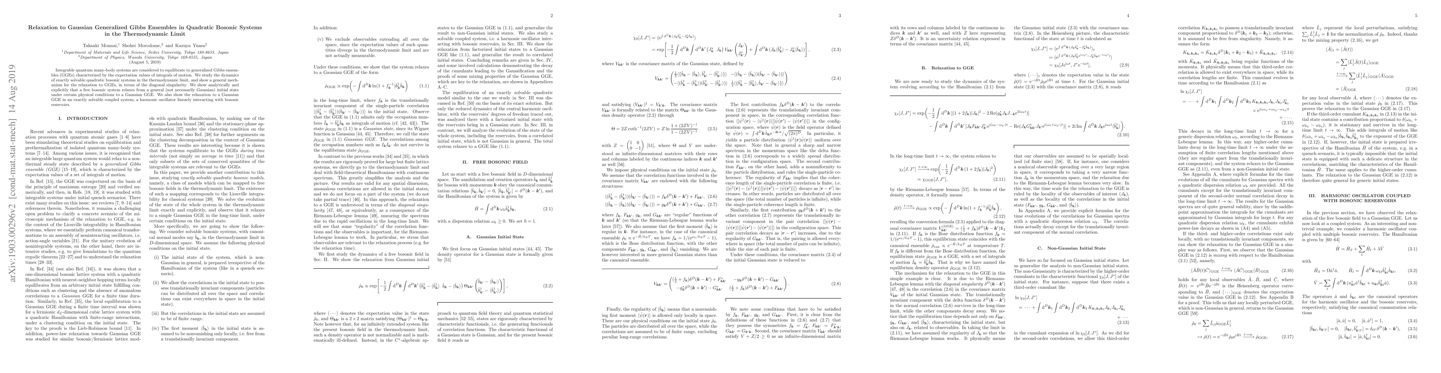 This paper investigates the relaxation dynamics of quadratic bosonic systems in the thermodynamic limit, demonstrating that they equilibrate to Gaussian Generalized Gibbs Ensembles (GGEs) under specific conditions. The study analytically shows that both free bosonic systems and coupled systems, such as a harmonic oscillator interacting with bosonic reservoirs, relax to Gaussian GGEs.