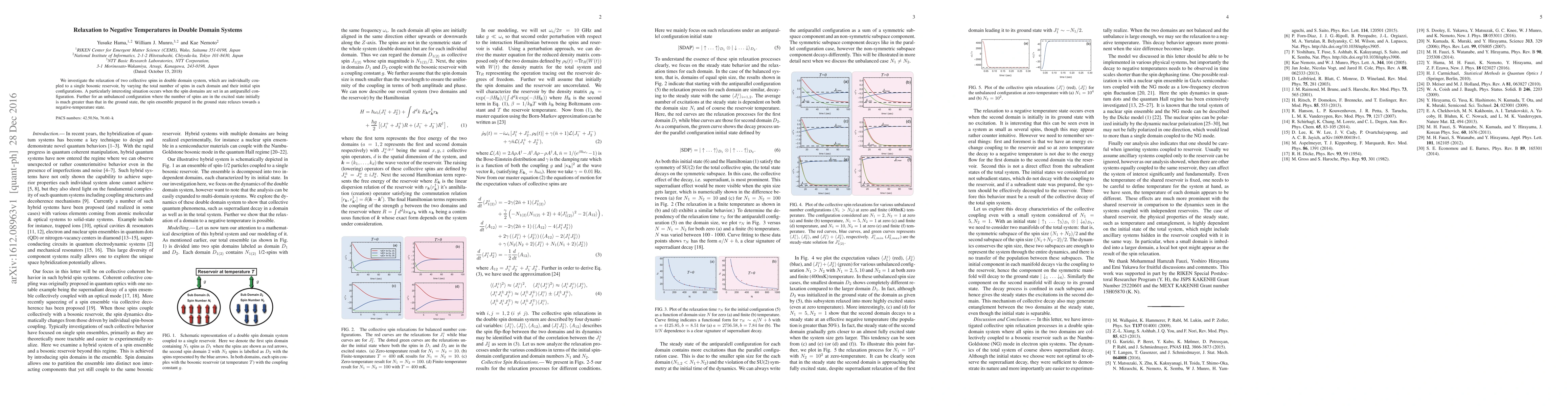 We investigate the relaxation of two collective spins in double domain system, which are individually coupled to a single bosonic reservoir, by varying the total number of spins in each domain and their initial spin configurations. A particularly interesting situation occurs when the spin domains are set in an antiparallel configuration. Further for an unbalanced configuration where the number of spins are in the excited state initially is much greater than that in the ground state, the spin ensemble prepared in the ground state relaxes towards a negative-temperature state.