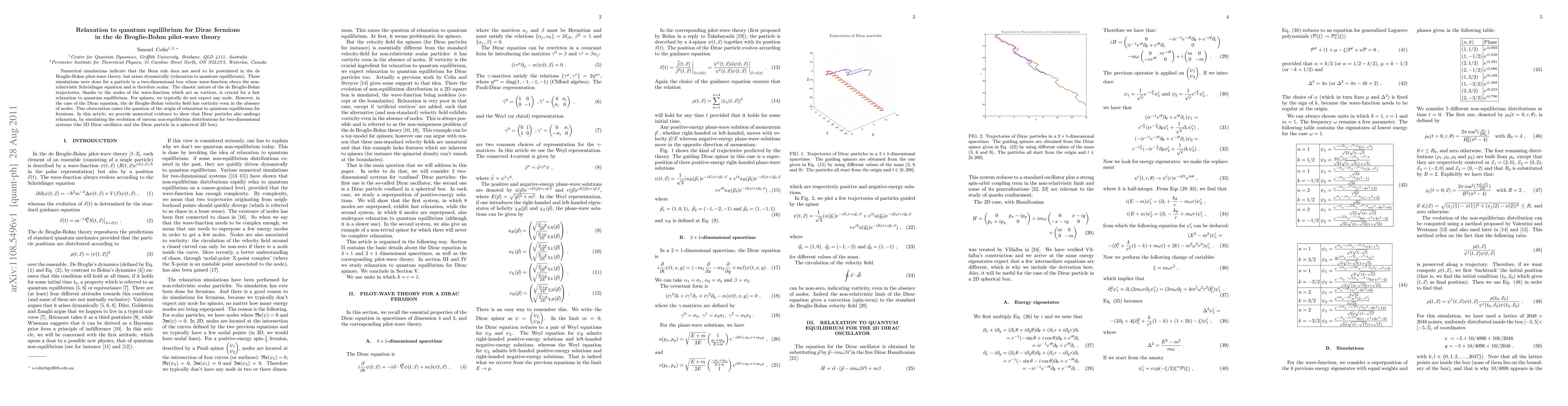This research demonstrates that Dirac fermions in the de Broglie-Bohm pilot-wave theory relax dynamically to quantum equilibrium, similar to scalar particles, despite lacking wave-function nodes. Numerical simulations of two-dimensional systems show that the chaotic trajectories of Dirac fermions facilitate this relaxation.