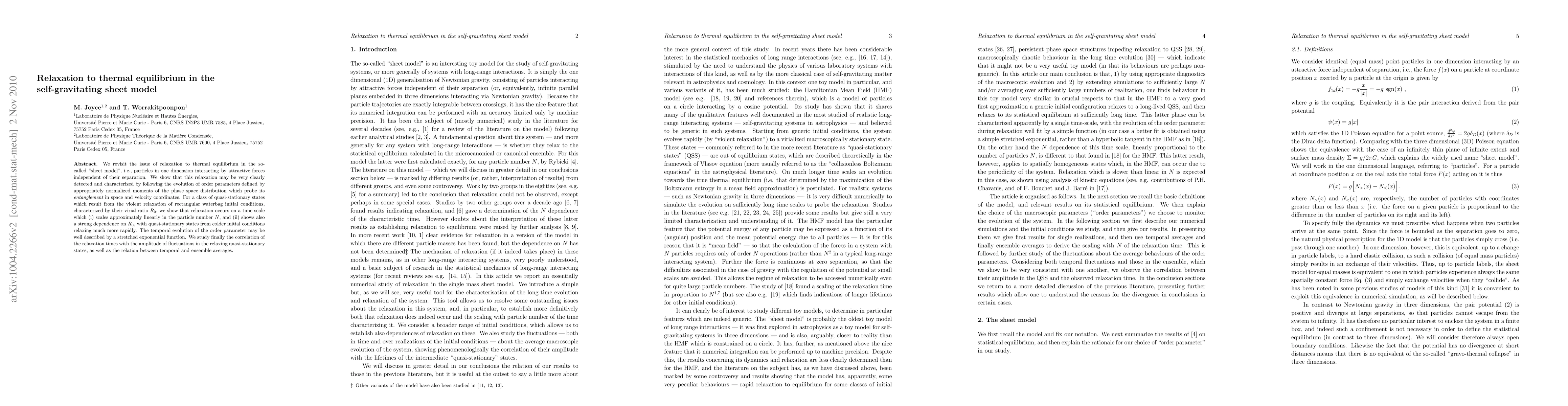 We revisit the issue of relaxation to thermal equilibrium in the so-called "sheet model", i.e., particles in one dimension interacting by attractive forces independent of their separation. We show that this relaxation may be very clearly detected and characterized by following the evolution of order parameters defined by appropriately normalized moments of the phase space distribution which probe its entanglement in space and velocity coordinates. For a class of quasi-stationary states which result from the violent relaxation of rectangular waterbag initial conditions, characterized by their virial ratio R_0, we show that relaxation occurs on a time scale which (i) scales approximately linearly in the particle number N, and (ii) shows also a strong dependence on R_0, with quasi-stationary states from colder initial conditions relaxing much more rapidly. The temporal evolution of the order parameter may be well described by a stretched exponential function. We study finally the correlation of the relaxation times with the amplitude of fluctuations in the relaxing quasi-stationary states, as well as the relation between temporal and ensemble averages.