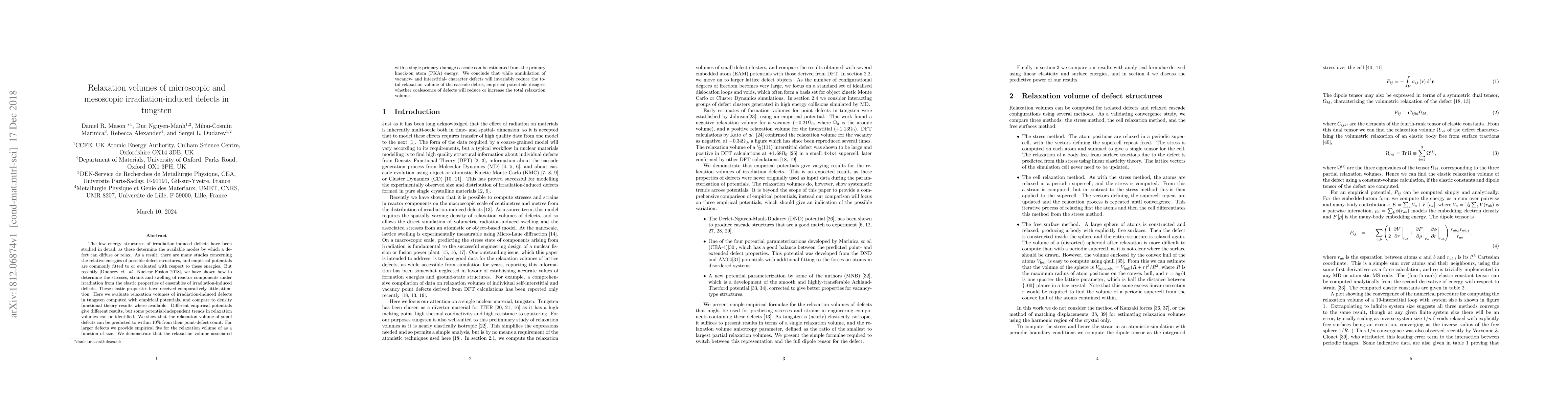 This paper investigates the relaxation volumes of microscopic and mesoscopic irradiation-induced defects in tungsten, comparing empirical potentials and density functional theory results. It finds that small defects' relaxation volumes can be predicted within 10% from their point-defect count, while larger defects' volumes require empirical fits based on size and primary knock-on atom energy.