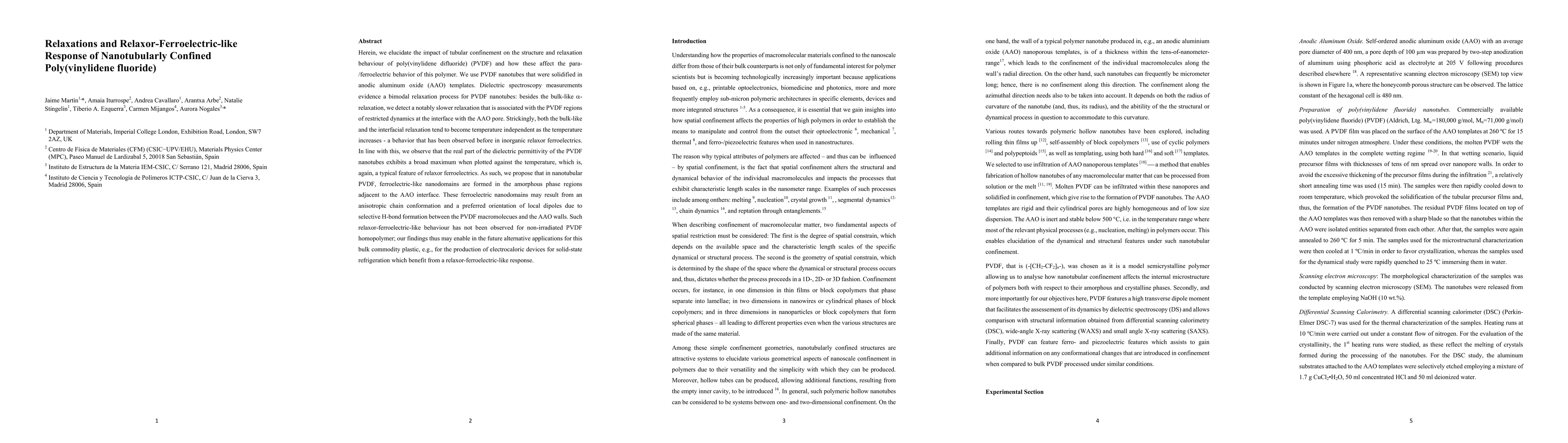 This paper investigates the structural and relaxation behavior of PVDF nanotubes confined within AAO templates, revealing a bimodal relaxation process and a relaxor-ferroelectric-like response. The findings suggest the formation of ferroelectric nanodomains in the amorphous phase near the AAO interface, potentially enabling new applications for PVDF in electrocaloric devices.