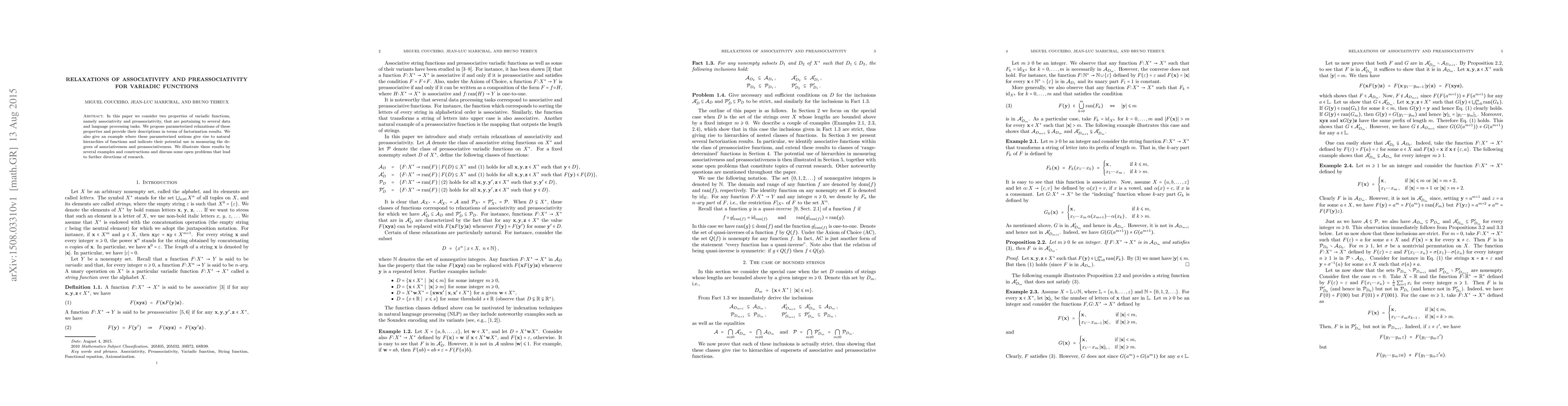 In this paper we consider two properties of variadic functions, namely associativity and preassociativity, that are pertaining to several data and language processing tasks. We propose parameterized relaxations of these properties and provide their descriptions in terms of factorization results. We also give an example where these parameterized notions give rise to natural hierarchies of functions and indicate their potential use in measuring the degrees of associativeness and preassociativeness. We illustrate these results by several examples and constructions and discuss some open problems that lead to further directions of research.