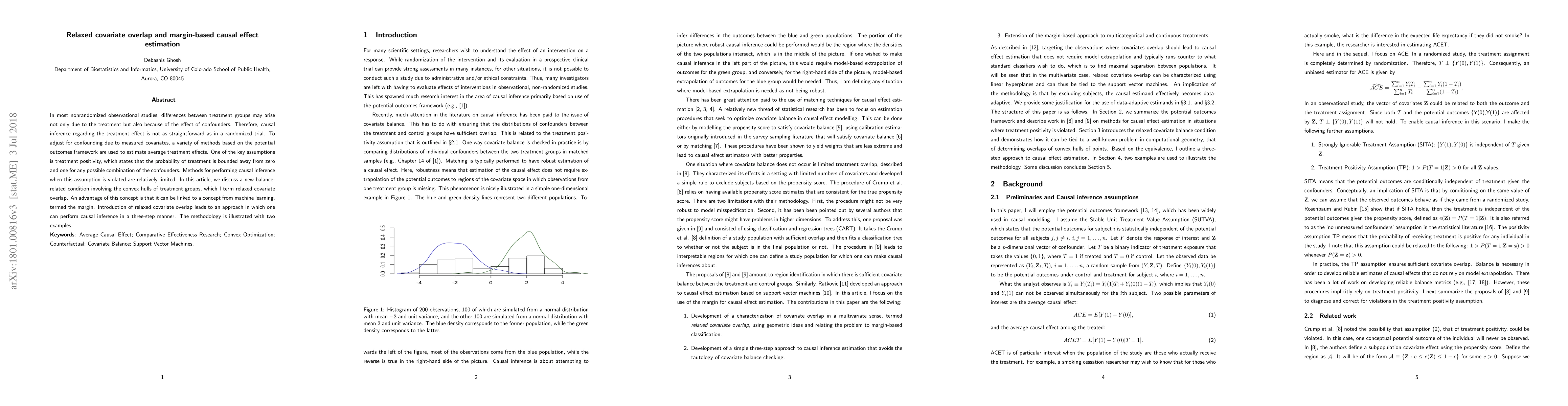 In most nonrandomized observational studies, differences between treatment groups may arise not only due to the treatment but also because of the effect of confounders. Therefore, causal inference regarding the treatment effect is not as straightforward as in a randomized trial. To adjust for confounding due to measured covariates, a variety of methods based on the potential outcomes framework are used to estimate average treatment effects. One of the key assumptions is treatment positivity, which states that the probability of treatment is bounded away from zero and one for any possible combination of the confounders. Methods for performing causal inference when this assumption is violated are relatively limited. In this article, we discuss a new balance-related condition involving the convex hulls of treatment groups, which I term relaxed covariate overlap. An advantage of this concept is that it can be linked to a concept from machine learning, termed the margin. Introduction of relaxed covariate overlap leads to an approach in which one can perform causal inference in a three-step manner. The methodology is illustrated with two examples.