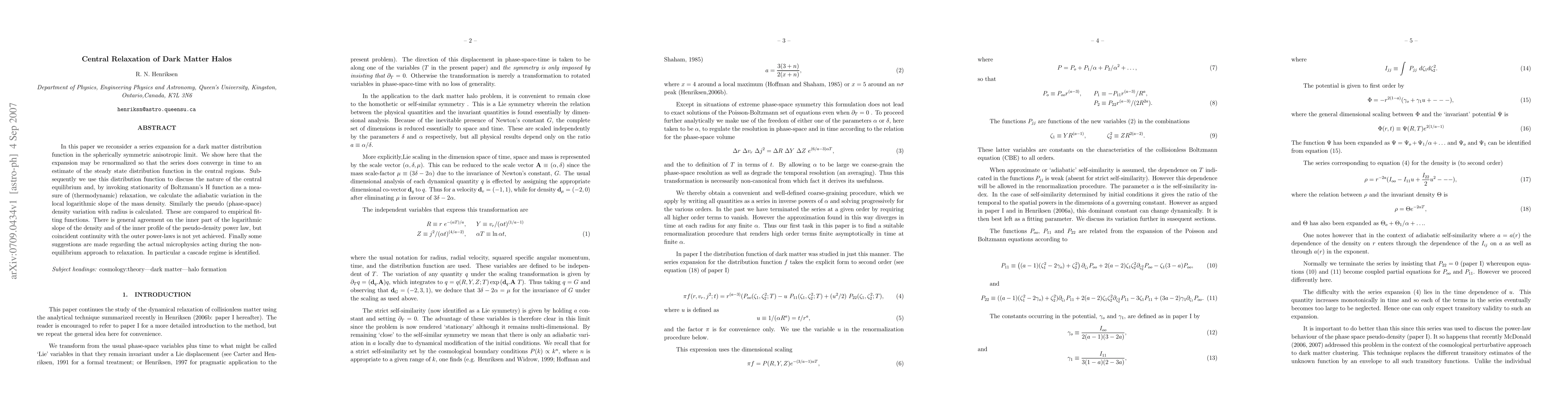 In this paper we reconsider a series expansion for a dark matter distribution function in the spherically symmetric anisotropic limit. We show here that the expansion may be renormalized so that the series does converge in time to an estimate of the steady state distribution function in the central regions. Subsequently we use this distribution function to discuss the nature of the central equilibrium and, by invoking stationarity of Boltzmann's H function as a measure of (thermodynamic) relaxation, we calculate the adiabatic variation in the local logarithmic slope of the mass density. Similarly the pseudo (phase-space) density variation with radius is calculated. These are compared to empirical fitting functions. There is general agreement on the inner part of the logarithmic slope of the density and of the inner profile of the pseudo-density power law, but coincident continuity with the outer power-laws is not yet achieved. Finally some suggestions are made regarding the actual microphysics acting during the non-equilibrium approach to relaxation. In particular a cascade regime is identified.
