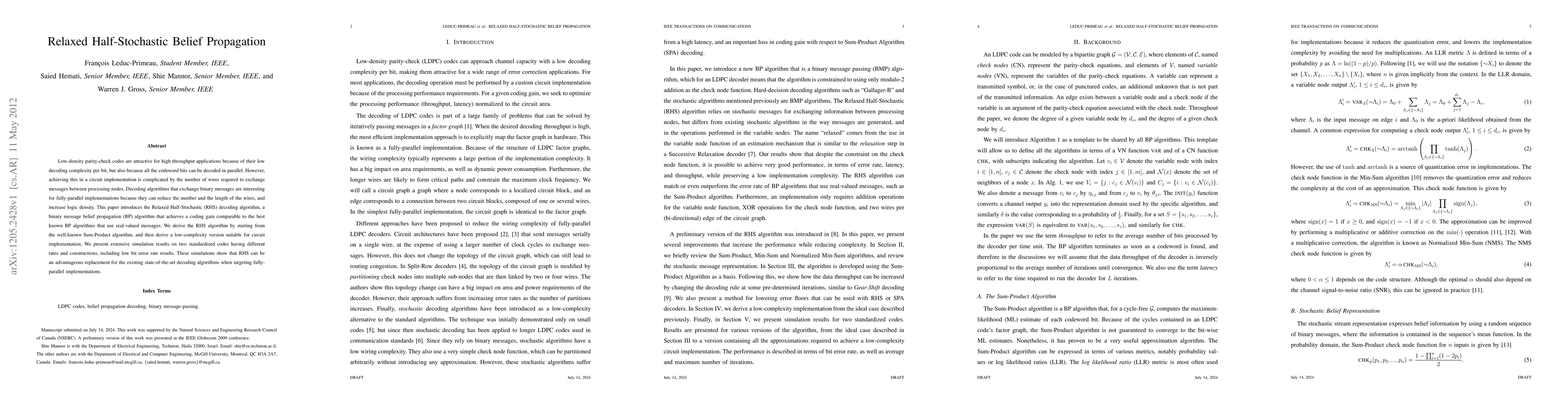 Low-density parity-check codes are attractive for high throughput applications because of their low decoding complexity per bit, but also because all the codeword bits can be decoded in parallel. However, achieving this in a circuit implementation is complicated by the number of wires required to exchange messages between processing nodes. Decoding algorithms that exchange binary messages are interesting for fully-parallel implementations because they can reduce the number and the length of the wires, and increase logic density. This paper introduces the Relaxed Half-Stochastic (RHS) decoding algorithm, a binary message belief propagation (BP) algorithm that achieves a coding gain comparable to the best known BP algorithms that use real-valued messages. We derive the RHS algorithm by starting from the well-known Sum-Product algorithm, and then derive a low-complexity version suitable for circuit implementation. We present extensive simulation results on two standardized codes having different rates and constructions, including low bit error rate results. These simulations show that RHS can be an advantageous replacement for the existing state-of-the-art decoding algorithms when targeting fully-parallel implementations.