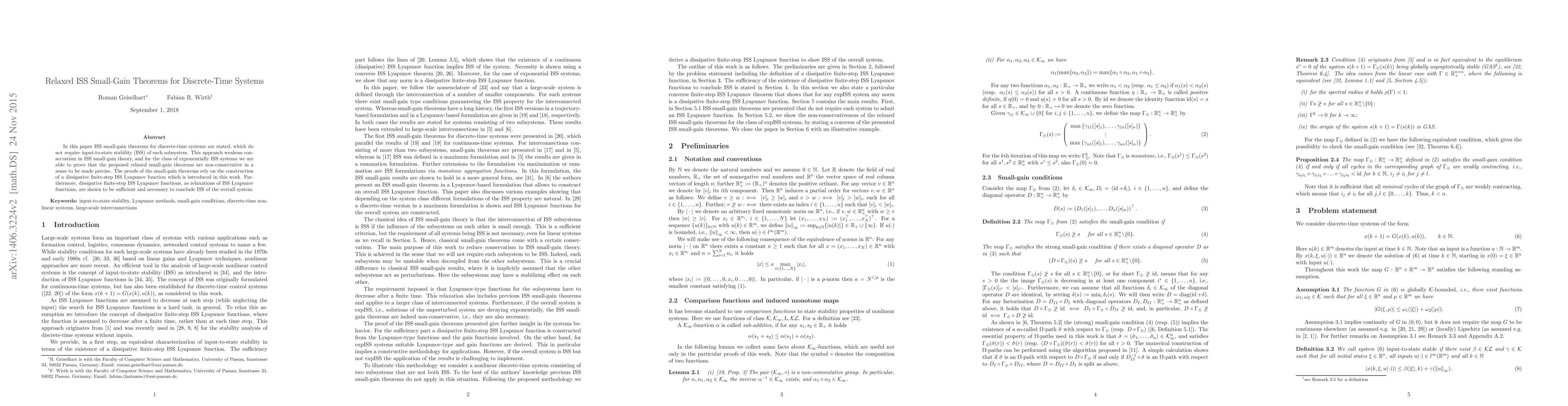 This paper proposes relaxed ISS small-gain theorems for discrete-time systems that do not require each subsystem to be ISS, thus reducing conservatism. The authors introduce dissipative finite-step ISS Lyapunov functions to prove these theorems, demonstrating their sufficiency and necessity for concluding overall system ISS.