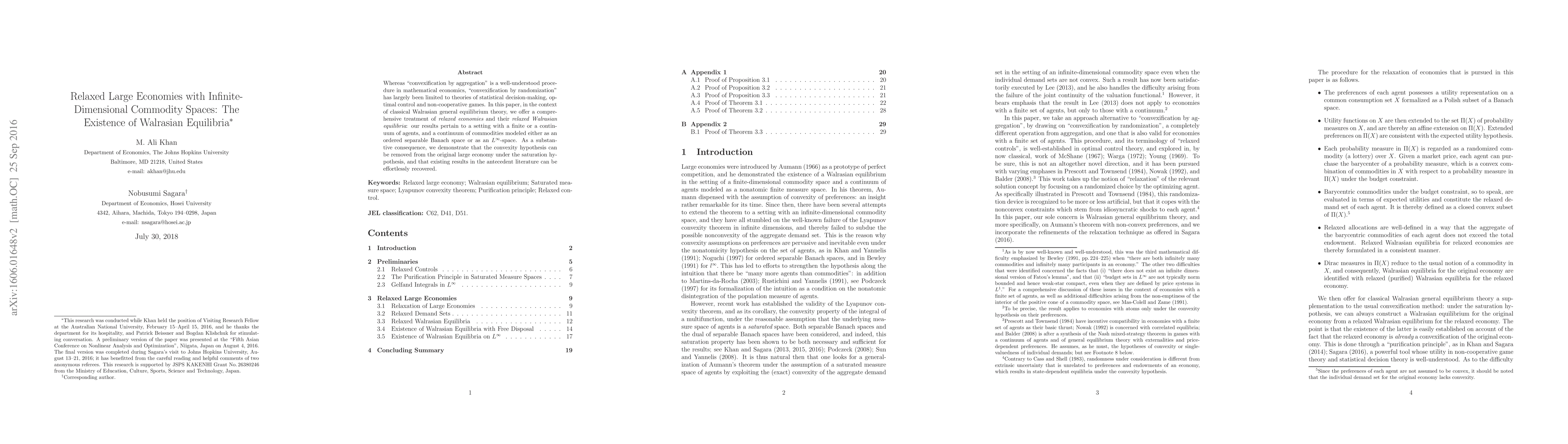This paper explores the existence of Walrasian equilibria in relaxed large economies with infinite-dimensional commodity spaces, introducing the concept of "convexification by randomization." It demonstrates that the convexity hypothesis can be removed under the saturation hypothesis, extending classical Walrasian equilibrium theory to settings with infinite-dimensional commodity spaces.