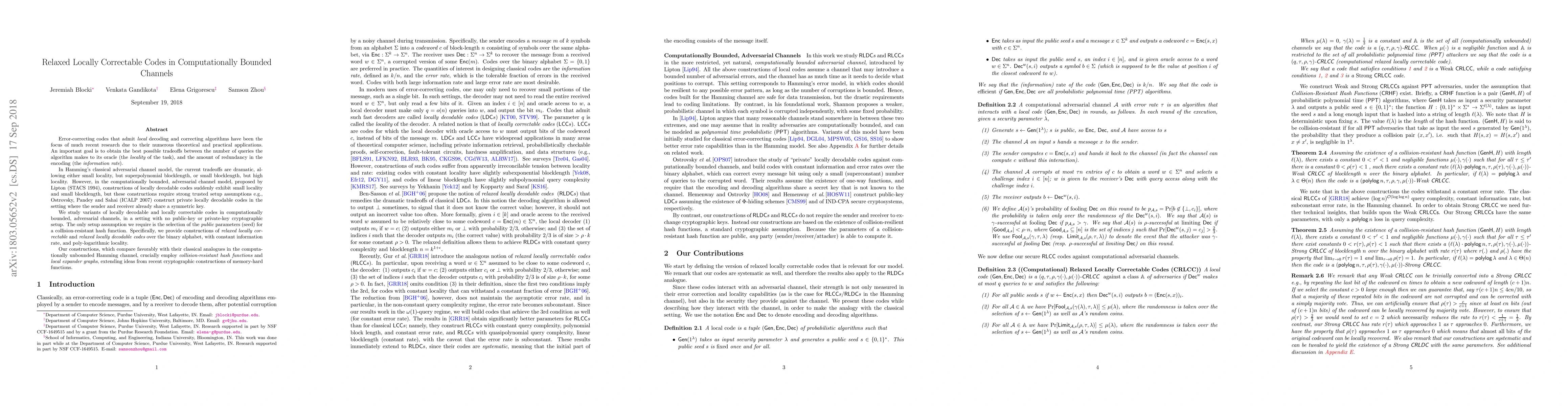 Researchers developed locally correctable codes that balance query locality with encoding redundancy in computationally bounded channels, achieving constant information rate and poly-logarithmic locality without requiring public-key or private-key setup.