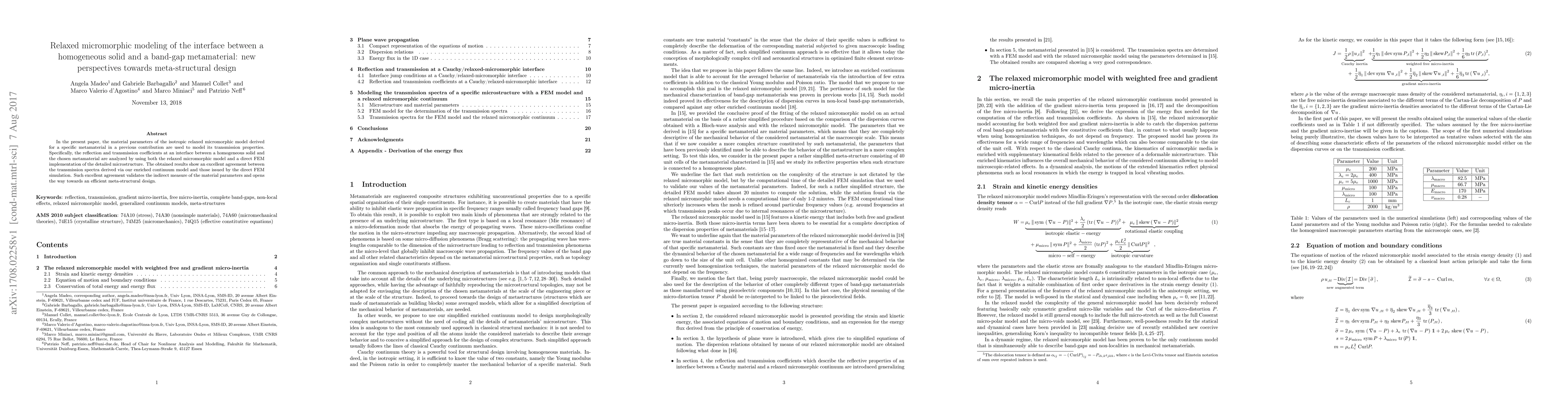 In the present paper, the material parameters of the isotropic relaxed micromorphic model derived for a specific metamaterial in a previous contribution are used to model its transmission properties. Specifically, the reflection and transmission coefficients at an interface between a homogeneous solid and the chosen metamaterial are analyzed by using both the relaxed micromorphic model and a direct FEM implementation of the detailed microstructure. The obtained results show an excellent agreement between the transmission spectra derived via our enriched continuum model and those issued by the direct FEM simulation. Such excellent agreement validates the indirect measure of the material parameters and opens the way towards an efficient meta-structural design.