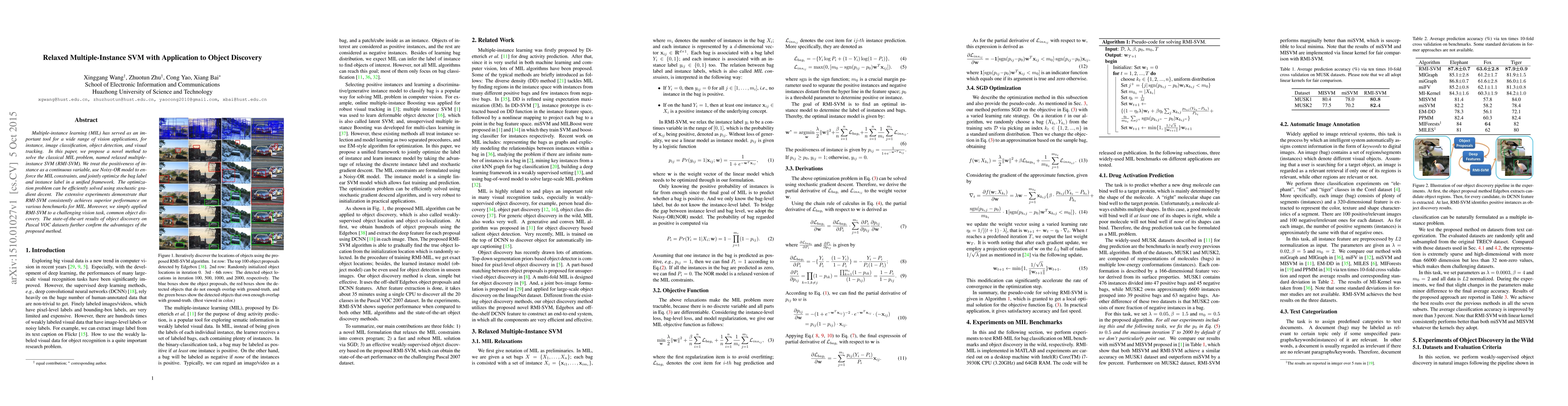 This paper introduces a novel relaxed multiple-instance SVM (RMI-SVM) method for solving the MIL problem, which treats instance positiveness as a continuous variable and optimizes both bag and instance labels jointly. RMI-SVM outperforms existing methods on various benchmarks and achieves state-of-the-art results in common object discovery tasks on Pascal VOC datasets.