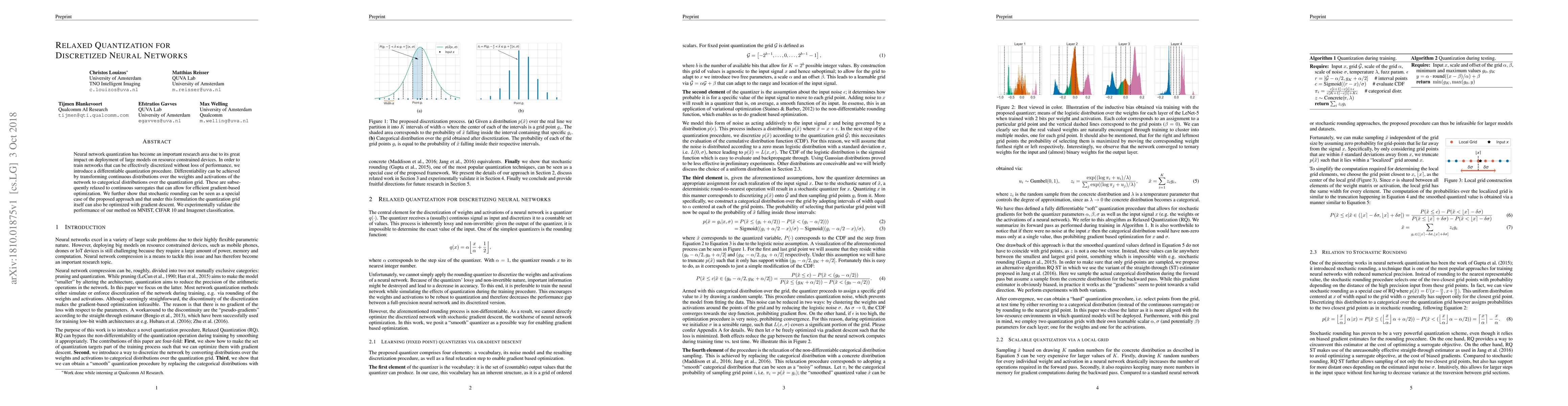 This paper introduces a differentiable quantization procedure for discretized neural networks, enabling efficient gradient-based optimization through relaxed quantization. The method optimizes both the quantization grid and the network weights, validated on MNIST, CIFAR 10, and ImageNet datasets.