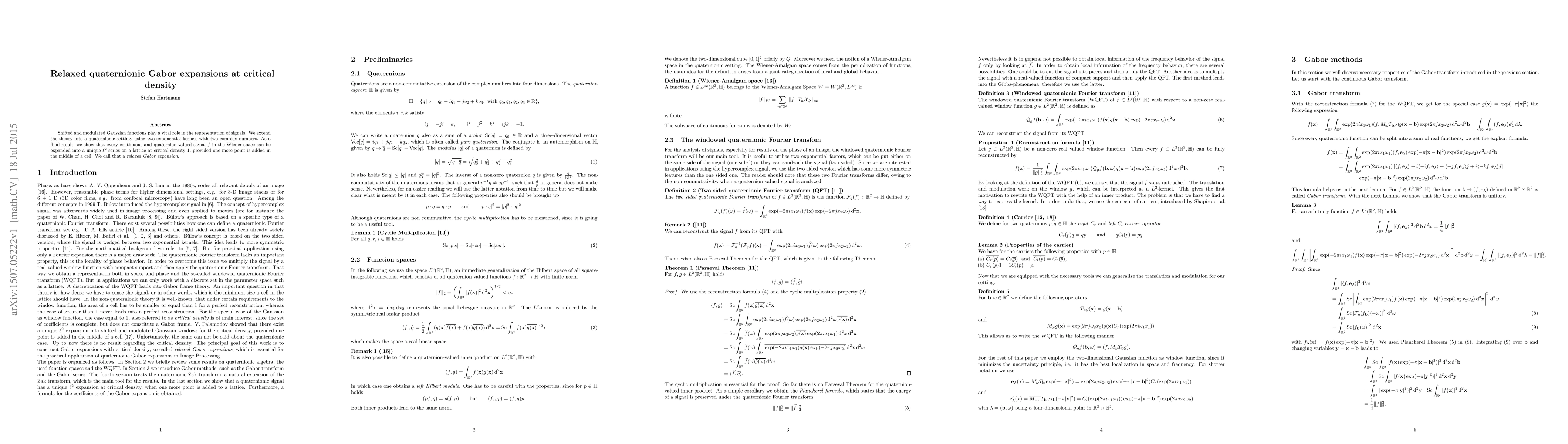 This paper extends Gabor expansions to quaternionic signals using two exponential kernels with complex numbers, demonstrating that any continuous quaternion-valued signal can be uniquely represented in a relaxed Gabor expansion at critical density $1$ with an additional central point per cell.
