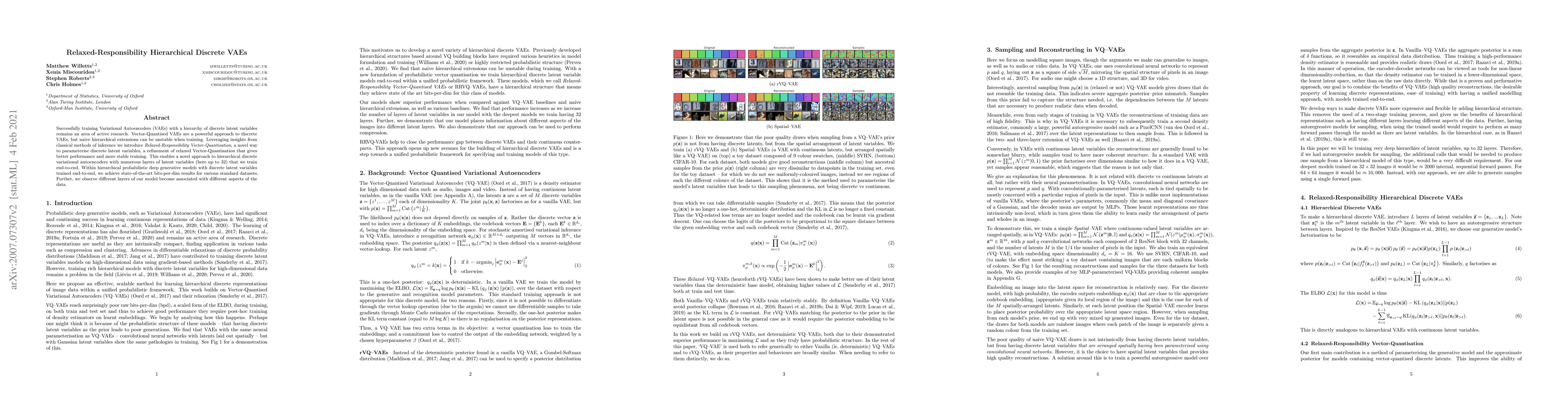 This paper introduces Relaxed-Responsibility Vector-Quantisation to stabilize training of hierarchical discrete Variational Autoencoders (VAEs). The method achieves state-of-the-art results in bits-per-dim for various datasets, enabling end-to-end training of models with up to 32 layers of latent variables.