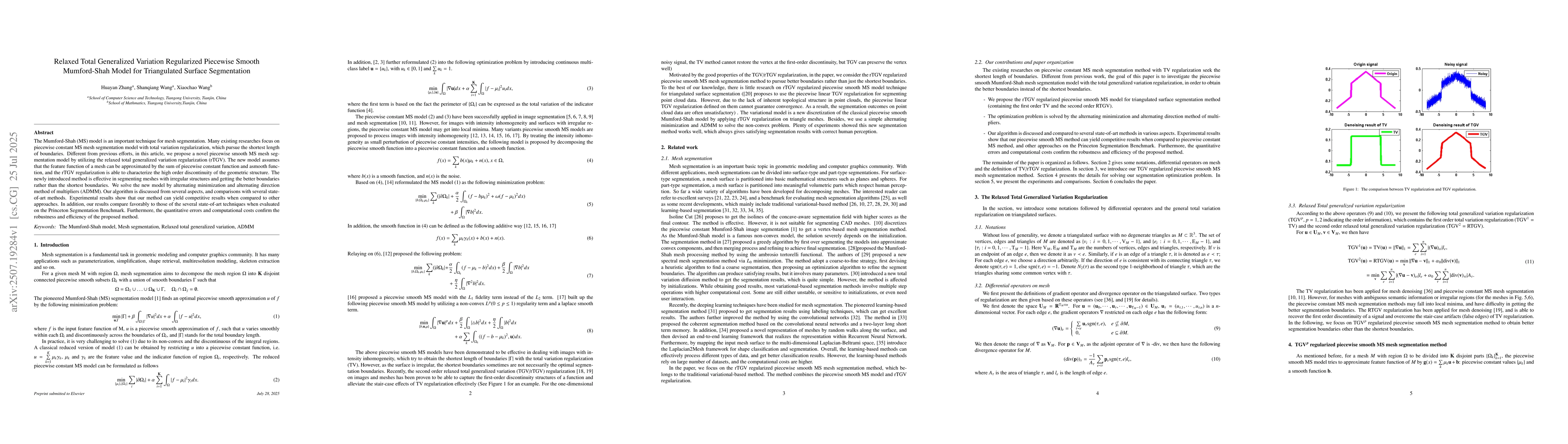 The Mumford-Shah (MS) model is an important technique for mesh segmentation. Many existing researches focus on piecewise constant MS mesh segmentation model with total variation regularization, which pursue the shortest length of boundaries. Different from previous efforts, in this article, we propose a novel piecewise smooth MS mesh segmentation model by utilizing the relaxed total generalized variation regularization (rTGV). The new model assumes that the feature function of a mesh can be approximated by the sum of piecewise constant function and asmooth function, and the rTGV regularization is able to characterize the high order discontinuity of the geometric structure. The newly introduced method is effective in segmenting meshes with irregular structures and getting the better boundaries rather than the shortest boundaries. We solve the new model by alternating minimization and alternating direction method of multipliers (ADMM). Our algorithm is discussed from several aspects, and comparisons with several state-of-art methods. Experimental results show that our method can yield competitive results when compared to other approaches. In addition, our results compare favorably to those of the several state-of-art techniques when evaluated on the Princeton Segmentation Benchmark. Furthermore, the quantitative errors and computational costs confirm the robustness and efficiency of the proposed method.