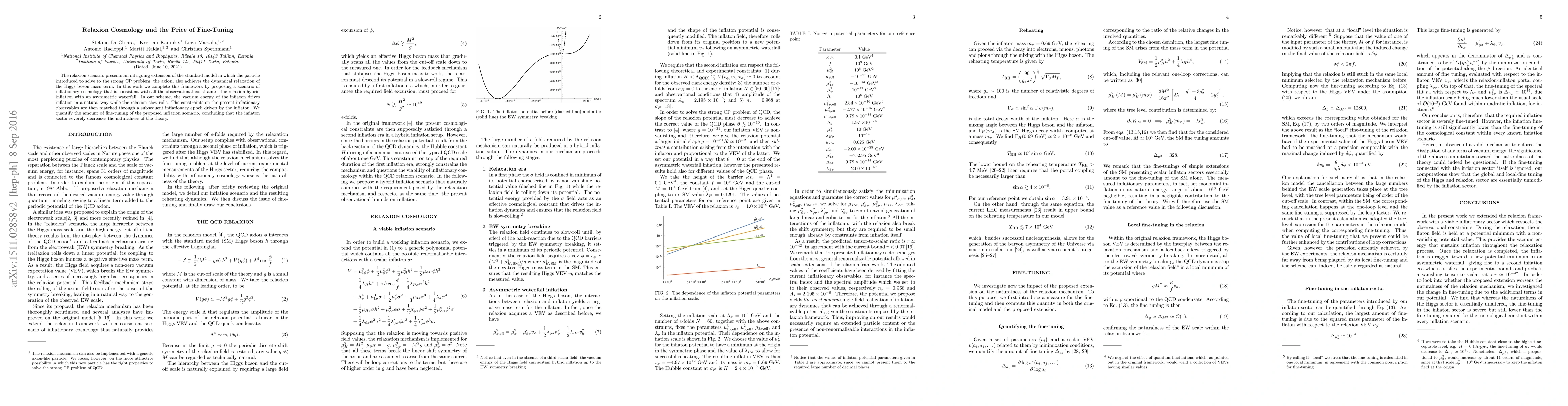 The relaxion scenario presents an intriguing extension of the standard model in which the particle introduced to solve to the strong CP problem, the axion, also achieves the dynamical relaxation of the Higgs boson mass term. In this work we complete this framework by proposing a scenario of inflationary cosmology that is consistent with all the observational constraints: the relaxion hybrid inflation with an asymmetric waterfall. In our scheme, the vacuum energy of the inflaton drives inflation in a natural way while the relaxion slow-rolls. The constraints on the present inflationary observables are then matched through a subsequent inflationary epoch driven by the inflaton. We quantify the amount of fine-tuning of the proposed inflation scenario, concluding that the inflaton sector severely decreases the naturalness of the theory.